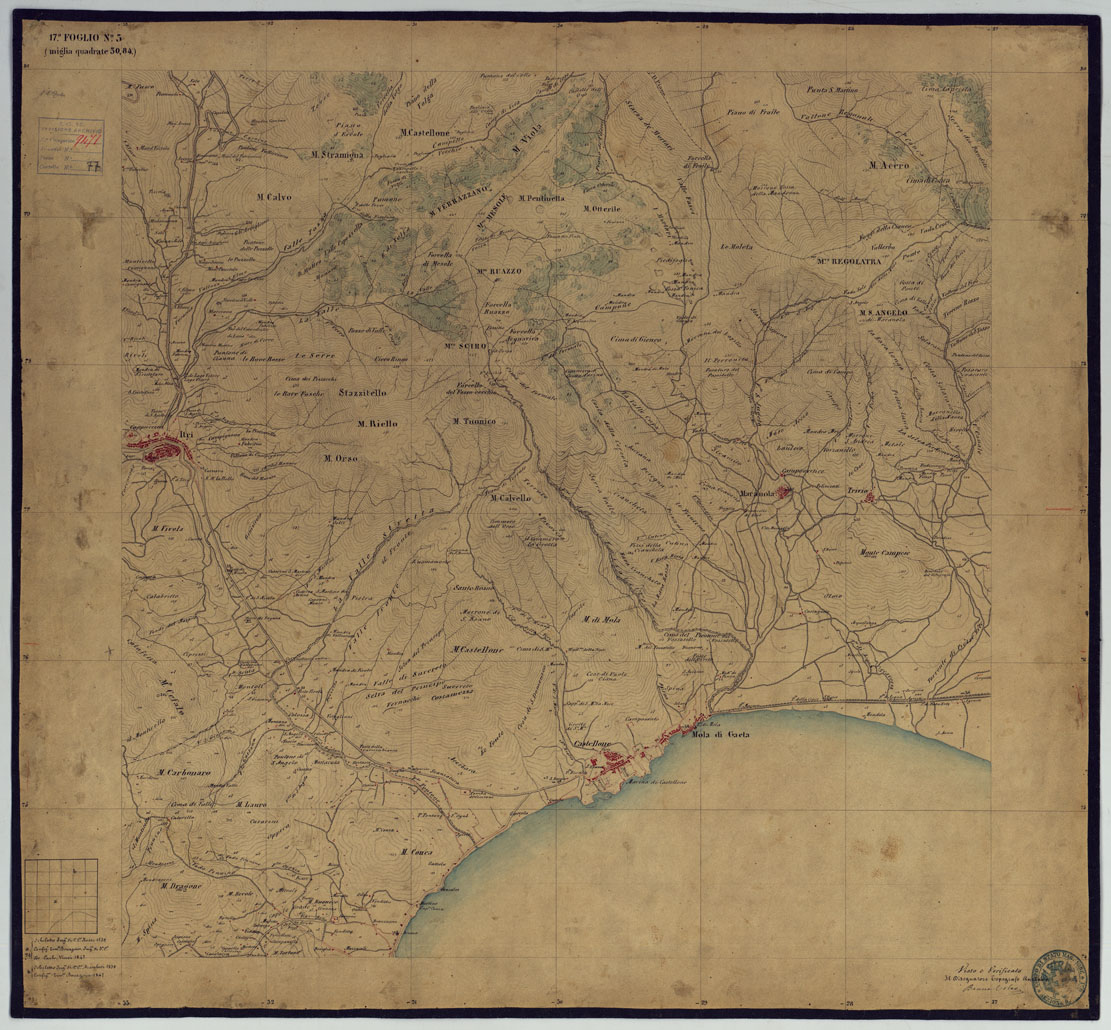 "Sono 167 tavolette montate su tela o seta, copiate e messe in netto all'Officio Topografico di Napoli su le levate eseguite dal 1834 al 1860 per la formazione della Carta del Reame di Napoli alla scala di 1:80.000. L'esecuzione di questa carta venne decretata nel 1814: essa fu però iniziata, dati i movimenti politici di quell'epoca, soltanto nel 1833. Queste tavolette si riferiscono ai fogli 1, 5, 8, 9, 12, 13, 17-19, 28, 29, 33 della suddetta carta la quale doveva essere disegnata ed incisa su rame a bulino in fogli rettangolari con orografia a tratteggio e curve di livello tracciate alla equidistanza di 10 passi (m. 18,52) o di 52 passi (m. 92,60). Di essa peraltro furono pubblicati solamente cinque fogli, cioè: Napoli, Caserta, Gaeta, Leonessa, Cittaducale, tra il 1861 e 1870. L'I.G.M. conserva i rami dei primi tre di questi fogli. La carta all'80.000, pregevolissima per valore artistico e scientifico, venne giudicata superiore alle altre produzioni cartografiche contemporanee non solo italiane, ma europee (cfr. Mori A., La cartografia ufficiale in Italia e l'I.G.M. 1922, pag.107). Le tavolette sono disegnate a colori rosso per gli abitati, azzurro per le acque, verde per le vegetazioni, nero per le curve di livello, rete stradale, toponomastica e il rimanente della planimetria. Rappresentano l'orografia con le curve di livello, sostituite al sistema di tratteggio fino allora seguito, parte tracciate direttamente dagli operatori, parte completate a tavolino in base ai dati raccolti. Le tavolette sono suddivise a gruppi in base al foglio della carta all'80.000 cui si riferiscono ciascun gruppo reca annesso i nomi degli operatori e il visto del topografo capo. Annesso un "Quadro d'unione delle levate alla scala di 1:20.000 eseguite fino a tutto il 1860 dal R. Officio Topografico Napoletano" alla scala di 1:490.700, stampato nel 1884. Il documento è ripartito in Cart. d'Arch. n°75 (che comprende 52 fogli), n° 76 (48 fogli), n° 77 (44 fogli)."