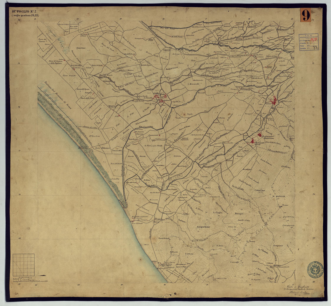 "Sono 167 tavolette montate su tela o seta, copiate e messe in netto all'Officio Topografico di Napoli su le levate eseguite dal 1834 al 1860 per la formazione della Carta del Reame di Napoli alla scala di 1:80.000. L'esecuzione di questa carta venne decretata nel 1814: essa fu però iniziata, dati i movimenti politici di quell'epoca, soltanto nel 1833. Queste tavolette si riferiscono ai fogli 1, 5, 8, 9, 12, 13, 17-19, 28, 29, 33 della suddetta carta la quale doveva essere disegnata ed incisa su rame a bulino in fogli rettangolari delle dimensioni di m. 0,55x0,82, con orografia a tratteggio e curve di livello tracciate alla equidistanza di 10 passi (m. 18,52) o di 52 passi (m. 92,60). Di essa peraltro furono pubblicati solamente cinque fogli, cioè: Napoli, Caserta, Gaeta, Leonessa, Cittaducale, tra il 1861 e 1870. L'I.G.M. conserva i rami dei primi tre di questi fogli. La carta all'80.000, pregevolissima per valore artistico e scientifico, venne giudicata superiore alle altre produzioni cartografiche contemporanee non solo italiane, ma europee (cfr. Mori A., La cartografia ufficiale in Italia e l'I.G.M. 1922, pag.107). Le tavolette sono disegnate a colori rosso per gli abitati, azzurro per le acque, verde per le vegetazioni, nero per le curve di livello, rete stradale, toponomastica e il rimanente della planimetria. Rappresentano l'orografia con le curve di livello, sostituite al sistema di tratteggio fino allora seguito, parte tracciate direttamente dagli operatori, parte completate a tavolino in base ai dati raccolti. Le tavolette sono suddivise a gruppi in base al foglio della carta all'80.000 cui si riferiscono ciascun gruppo reca annesso i nomi degli operatori e il visto del topografo capo. Annesso un "Quadro d'unione delle levate alla scala di 1:20.000 eseguite fino a tutto il 1860 dal R. Officio Topografico Napoletano" alla scala di 1:490.700, stampato nel 1884. Il documento è ripartito in Cart. d'Arch. n°75 (che comprende 52 fogli), n° 76 (48 fogli), n° 77 (44 fogli)."