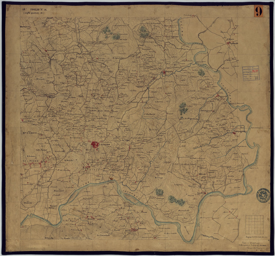 "Sono 167 tavolette montate su tela o seta, copiate e messe in netto all'Officio Topografico di Napoli su le levate eseguite dal 1834 al 1860 per la formazione della Carta del Reame di Napoli alla scala di 1:80.000. L'esecuzione di questa carta venne decretata nel 1814: essa fu però iniziata, dati i movimenti politici di quell'epoca, soltanto nel 1833. Queste tavolette si riferiscono ai fogli 1, 5, 8, 9, 12, 13, 17-19, 28, 29, 33 della suddetta carta la quale doveva essere disegnata ed incisa su rame a bulino in fogli rettangolari con orografia a tratteggio e curve di livello tracciate alla equidistanza di 10 passi (m. 18,52) o di 52 passi (m. 92,60). Di essa peraltro furono pubblicati solamente cinque fogli, cioè: Napoli, Caserta, Gaeta, Leonessa, Cittaducale, tra il 1861 e 1870. L'I.G.M. conserva i rami dei primi tre di questi fogli. La carta all'80.000, pregevolissima per valore artistico e scientifico, venne giudicata superiore alle altre produzioni cartografiche contemporanee non solo italiane, ma europee (cfr. Mori A., La cartografia ufficiale in Italia e l'I.G.M. 1922, pag.107). Le tavolette sono disegnate a colori rosso per gli abitati, azzurro per le acque, verde per le vegetazioni, nero per le curve di livello, rete stradale, toponomastica e il rimanente della planimetria. Rappresentano l'orografia con le curve di livello, sostituite al sistema di tratteggio fino allora seguito, parte tracciate direttamente dagli operatori, parte completate a tavolino in base ai dati raccolti. Le tavolette sono suddivise a gruppi in base al foglio della carta all'80.000 cui si riferiscono ciascun gruppo reca annesso i nomi degli operatori e il visto del topografo capo. Annesso un "Quadro d'unione delle levate alla scala di 1:20.000 eseguite fino a tutto il 1860 dal R. Officio Topografico Napoletano" alla scala di 1:490.700, stampato nel 1884. Il documento è ripartito in Cart. d'Arch. n°75 (che comprende 52 fogli), n° 76 (48 fogli), n° 77 (44 fogli)."