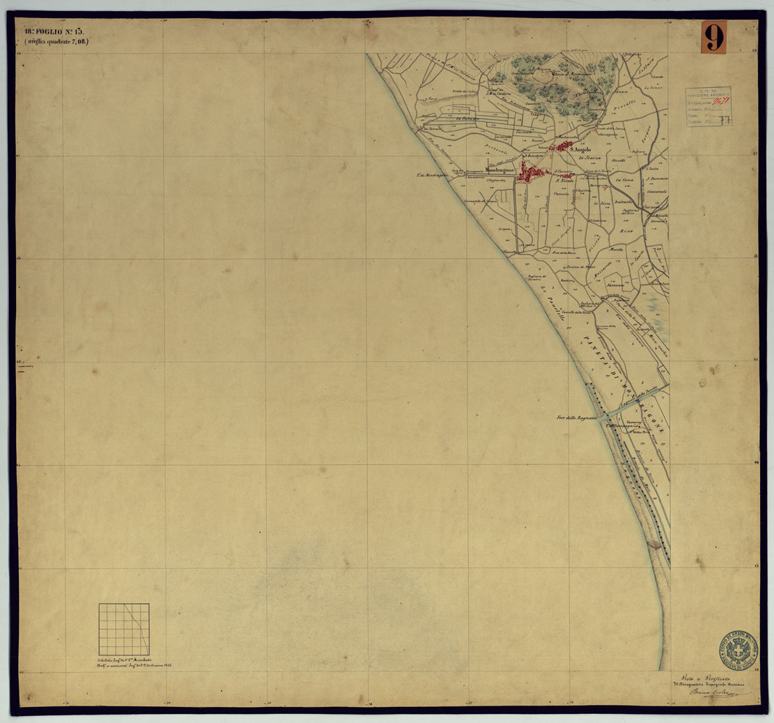 "Sono 167 tavolette montate su tela o seta, copiate e messe in netto all'Officio Topografico di Napoli su le levate eseguite dal 1834 al 1860 per la formazione della Carta del Reame di Napoli alla scala di 1:80.000. L'esecuzione di questa carta venne decretata nel 1814: essa fu però iniziata, dati i movimenti politici di quell'epoca, soltanto nel 1833. Queste tavolette si riferiscono ai fogli 1, 5, 8, 9, 12, 13, 17-19, 28, 29, 33 della suddetta carta la quale doveva essere disegnata ed incisa su rame a bulino in fogli rettangolari con orografia a tratteggio e curve di livello tracciate alla equidistanza di 10 passi (m. 18,52) o di 52 passi (m. 92,60). Di essa peraltro furono pubblicati solamente cinque fogli, cioè: Napoli, Caserta, Gaeta, Leonessa, Cittaducale, tra il 1861 e 1870. L'I.G.M. conserva i rami dei primi tre di questi fogli. La carta all'80.000, pregevolissima per valore artistico e scientifico, venne giudicata superiore alle altre produzioni cartografiche contemporanee non solo italiane, ma europee (cfr. Mori A., La cartografia ufficiale in Italia e l'I.G.M. 1922, pag.107). Le tavolette sono disegnate a colori rosso per gli abitati, azzurro per le acque, verde per le vegetazioni, nero per le curve di livello, rete stradale, toponomastica e il rimanente della planimetria. Rappresentano l'orografia con le curve di livello, sostituite al sistema di tratteggio fino allora seguito, parte tracciate direttamente dagli operatori, parte completate a tavolino in base ai dati raccolti. Le tavolette sono suddivise a gruppi in base al foglio della carta all'80.000 cui si riferiscono ciascun gruppo reca annesso i nomi degli operatori e il visto del topografo capo. Annesso un "Quadro d'unione delle levate alla scala di 1:20.000 eseguite fino a tutto il 1860 dal R. Officio Topografico Napoletano" alla scala di 1:490.700, stampato nel 1884. Il documento è ripartito in Cart. d'Arch. n°75 (che comprende 52 fogli), n° 76 (48 fogli), n° 77 (44 fogli)."