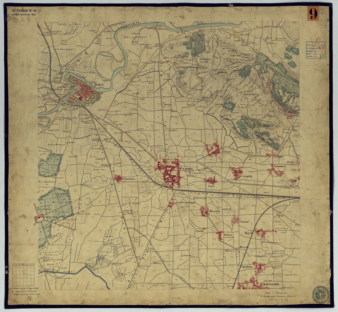 "Sono 167 tavolette montate su tela o seta, copiate e messe in netto all'Officio Topografico di Napoli su le levate eseguite dal 1834 al 1860 per la formazione della Carta del Reame di Napoli alla scala di 1:80.000. L'esecuzione di questa carta venne decretata nel 1814: essa fu però iniziata, dati i movimenti politici di quell'epoca, soltanto nel 1833. Queste tavolette si riferiscono ai fogli 1, 5, 8, 9, 12, 13, 17-19, 28, 29, 33 della suddetta carta la quale doveva essere disegnata ed incisa su rame a bulino in fogli rettangolari con orografia a tratteggio e curve di livello tracciate alla equidistanza di 10 passi (m. 18,52) o di 52 passi (m. 92,60). Di essa peraltro furono pubblicati solamente cinque fogli, cioè: Napoli, Caserta, Gaeta, Leonessa, Cittaducale, tra il 1861 e 1870. L'I.G.M. conserva i rami dei primi tre di questi fogli. La carta all'80.000, pregevolissima per valore artistico e scientifico, venne giudicata superiore alle altre produzioni cartografiche contemporanee non solo italiane, ma europee (cfr. Mori A., La cartografia ufficiale in Italia e l'I.G.M. 1922, pag.107). Le tavolette sono disegnate a colori rosso per gli abitati, azzurro per le acque, verde per le vegetazioni, nero per le curve di livello, rete stradale, toponomastica e il rimanente della planimetria. Rappresentano l'orografia con le curve di livello, sostituite al sistema di tratteggio fino allora seguito, parte tracciate direttamente dagli operatori, parte completate a tavolino in base ai dati raccolti. Le tavolette sono suddivise a gruppi in base al foglio della carta all'80.000 cui si riferiscono ciascun gruppo reca annesso i nomi degli operatori e il visto del topografo capo. Annesso un "Quadro d'unione delle levate alla scala di 1:20.000 eseguite fino a tutto il 1860 dal R. Officio Topografico Napoletano" alla scala di 1:490.700, stampato nel 1884. Il documento è ripartito in Cart. d'Arch. n°75 (che comprende 52 fogli), n° 76 (48 fogli), n° 77 (44 fogli)."