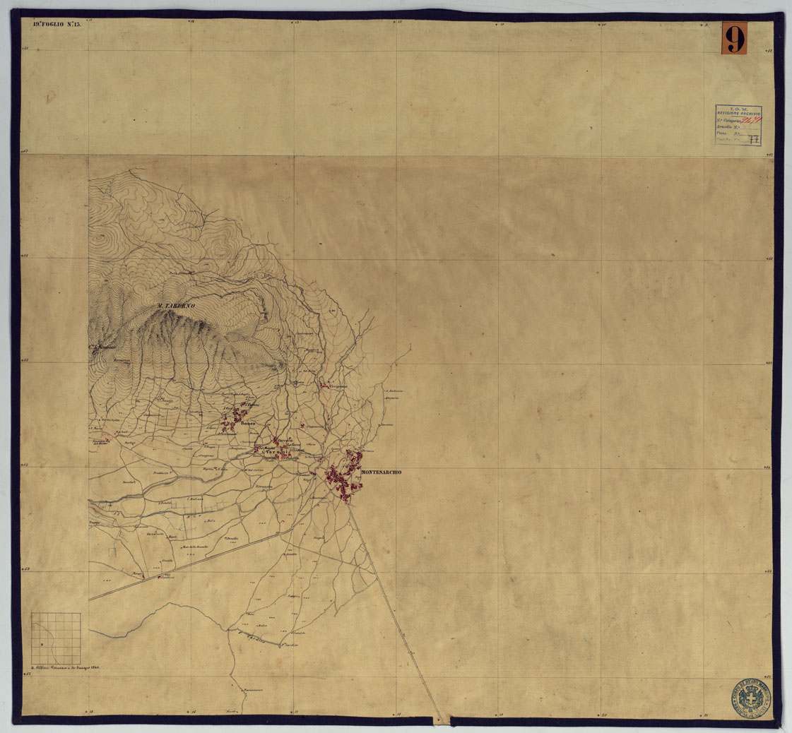"Sono 167 tavolette montate su tela o seta, copiate e messe in netto all'Officio Topografico di Napoli su le levate eseguite dal 1834 al 1860 per la formazione della Carta del Reame di Napoli alla scala di 1:80.000. L'esecuzione di questa carta venne decretata nel 1814: essa fu però iniziata, dati i movimenti politici di quell'epoca, soltanto nel 1833. Queste tavolette si riferiscono ai fogli 1, 5, 8, 9, 12, 13, 17-19, 28, 29, 33 della suddetta carta la quale doveva essere disegnata ed incisa su rame a bulino in fogli rettangolari con orografia a tratteggio e curve di livello tracciate alla equidistanza di 10 passi (m. 18,52) o di 52 passi (m. 92,60). Di essa peraltro furono pubblicati solamente cinque fogli, cioè: Napoli, Caserta, Gaeta, Leonessa, Cittaducale, tra il 1861 e 1870. L'I.G.M. conserva i rami dei primi tre di questi fogli. La carta all'80.000, pregevolissima per valore artistico e scientifico, venne giudicata superiore alle altre produzioni cartografiche contemporanee non solo italiane, ma europee (cfr. Mori A., La cartografia ufficiale in Italia e l'I.G.M. 1922, pag.107). Le tavolette sono disegnate a colori rosso per gli abitati, azzurro per le acque, verde per le vegetazioni, nero per le curve di livello, rete stradale, toponomastica e il rimanente della planimetria. Rappresentano l'orografia con le curve di livello, sostituite al sistema di tratteggio fino allora seguito, parte tracciate direttamente dagli operatori, parte completate a tavolino in base ai dati raccolti. Le tavolette sono suddivise a gruppi in base al foglio della carta all'80.000 cui si riferiscono ciascun gruppo reca annesso i nomi degli operatori e il visto del topografo capo. Annesso un "Quadro d'unione delle levate alla scala di 1:20.000 eseguite fino a tutto il 1860 dal R. Officio Topografico Napoletano" alla scala di 1:490.700, stampato nel 1884. Il documento è ripartito in Cart. d'Arch. n°75 (che comprende 52 fogli), n° 76 (48 fogli), n° 77 (44 fogli)."