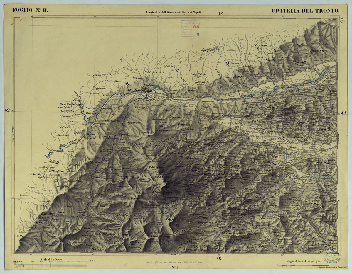 "Sono 24 fogli modello che dovevano servire per una carta delle Proivincie Meridionali alla scala di 1:50.000, disegnata su pietra sul tipo di quella del Piemonte alla stessa scala. Questa carta venne abbandonata quando fu decisa l'esecuzione della Carta d'Italia al 100.000. Questi fogli rappresentano l'orografia mediante un fine artistico tratteggio, acque in azzurro, rimenente in nero. Per nitidezza di disegno ed evidenza di rappresentazione alcuni di essi, sono opera veramente pregevole. Non tutti i fogli sono completi: ognuno reca le firme degli operatori. Il titolo non è presente sulla carta. "