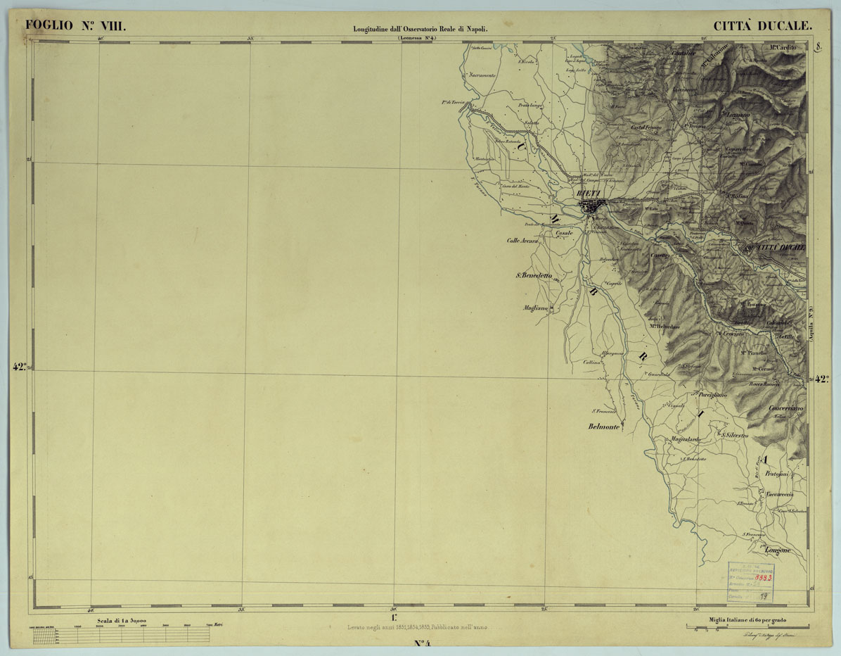 "Sono 24 fogli modello che dovevano servire per una carta delle Provincie Meridionali alla scala di 1:50.000, disegnata su pietra sul tipo di quella del Piemonte alla stessa scala. Questa carta venne abbandonata quando fu decisa l'esecuzione della Carta d'Italia al 100.000. Questi fogli rappresentano l'orografia mediante un fine artistico tratteggio, acque in azzurro, rimanente in nero. Per nitidezza di disegno ed evidenza di rappresentazione alcuni di essi, sono opera veramente pregevole. Non tutti i fogli sono completi: ognuno reca le firme degli operatori. Il titolo non è presente sulla carta."