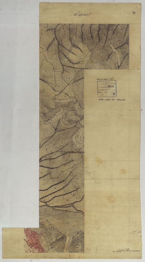"Elementi originali che hanno servito per la formazione delle tavolette della CARTA TOPOGRAFICA DEL MONTE VESUVIO RILEVATA E DISEGNATA DAGLI ALLIEVI DELL'IST. TOPOGRAFICO MILITARE NEGLI ANNI 1875-76 ALLA SCALA DI 1:10.000 archiviata in questo stesso documento (n° d'Ordine 65 - Cart. d'Arch. 80 - Docum. 9618. Annessi lucidi d'insieme. Il titolo non è presente sulla carta. "