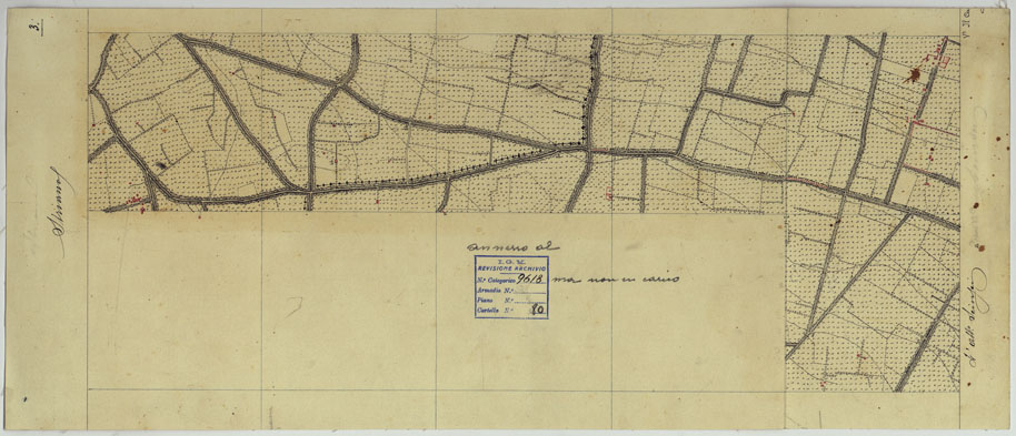 "Elementi originali che hanno servito per la formazione delle tavolette della CARTA TOPOGRAFICA DEL MONTE VESUVIO RILEVATA E DISEGNATA DAGLI ALLIEVI DELL'IST. TOPOGRAFICO MILITARE NEGLI ANNI 1875-76 ALLA SCALA DI 1:10.000 archiviata in questo stesso documento (n° d'Ordine 65 - Cart. d'Arch. 80 - Docum. 9618. Annessi lucidi d'insieme. Il titolo non è presente sulla carta. Il titolo del documento riporta Striano, ma nell'attuale divisione comunale, il territorio della minuta è compreso nei comuni di San Gennaro Vesuviano, Poggiomarino e Palma Campania e più precisamente nel territorio compreso fra Poggiomarino e San Gennaro Vesuviano."