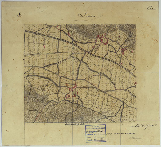 "Elementi originali in 42 spezzoni che hanno servito per la formazione delle tavolette della CARTA TOPOGRAFICA DEL MONTE VESUVIO RILEVATA E DISEGNATA DAGLI ALLIEVI DELL'IST. TOPOGRAFICO MILITARE NEGLI ANNI 1875-76 ALLA SCALA DI 1:10.000 archiviata in questo stesso documento (n° d'Ordine 65 - Cart. d'Arch. 80 - Docum. 9618 ). Annessi lucidi d'insieme. I centri abitati sono Pago della Valle di Lauro e Casola."