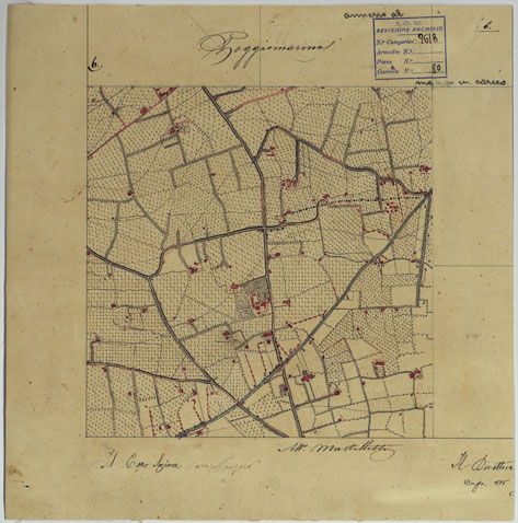 "Elementi originali che hanno servito per la formazione delle tavolette della CARTA TOPOGRAFICA DEL MONTE VESUVIO RILEVATA E DISEGNATA DAGLI ALLIEVI DELL'IST. TOPOGRAFICO MILITARE NEGLI ANNI 1875-76 ALLA SCALA DI 1:10.000 archiviata in questo stesso documento (n° d'Ordine 65 - Cart. d'Arch. 80 - Docum. 9618. Annessi lucidi d'insieme. Il titolo non è presente sulla carta. Il titolo del documento riporta Poggiomarino, ma nell'attuale divisione comunale, il territorio della minuta è compreso nei comuni di Terzigno, Boscoreale e Scafati e più precisamente nelle frazioni di I Pellegrini e Passanti."