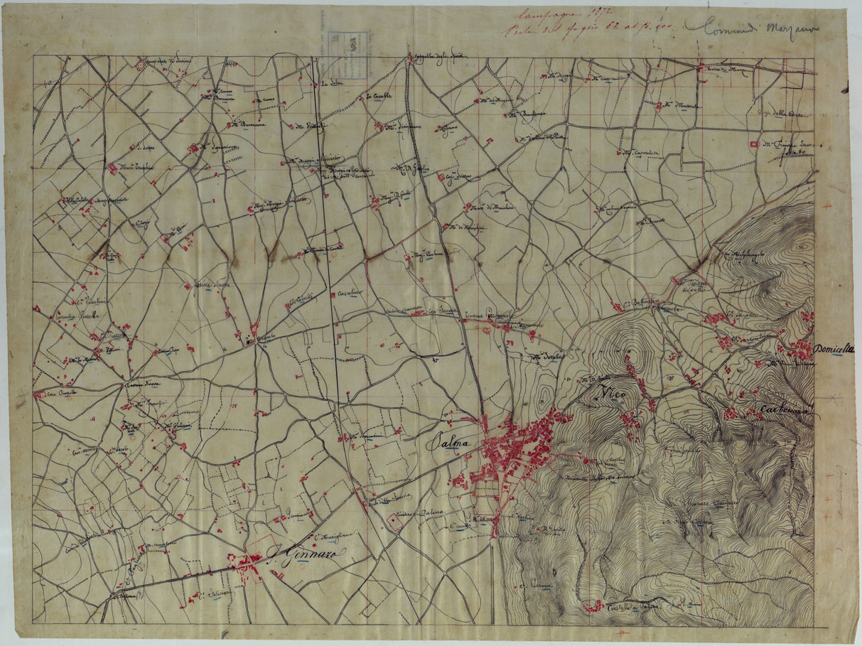 "Elementi originali che hanno servito per la formazione delle tavolette della CARTA TOPOGRAFICA DEL MONTE VESUVIO RILEVATA E DISEGNATA DAGLI ALLIEVI DELL'IST. TOPOGRAFICO MILITARE NEGLI ANNI 1875-76 ALLA SCALA DI 1:10.000 archiviata in questo stesso documento (n° d'Ordine 65 - Cart. d'Arch. 80 - Docum. 9618. Annessi lucidi d'insieme. Il titolo non è presente sulla carta. "