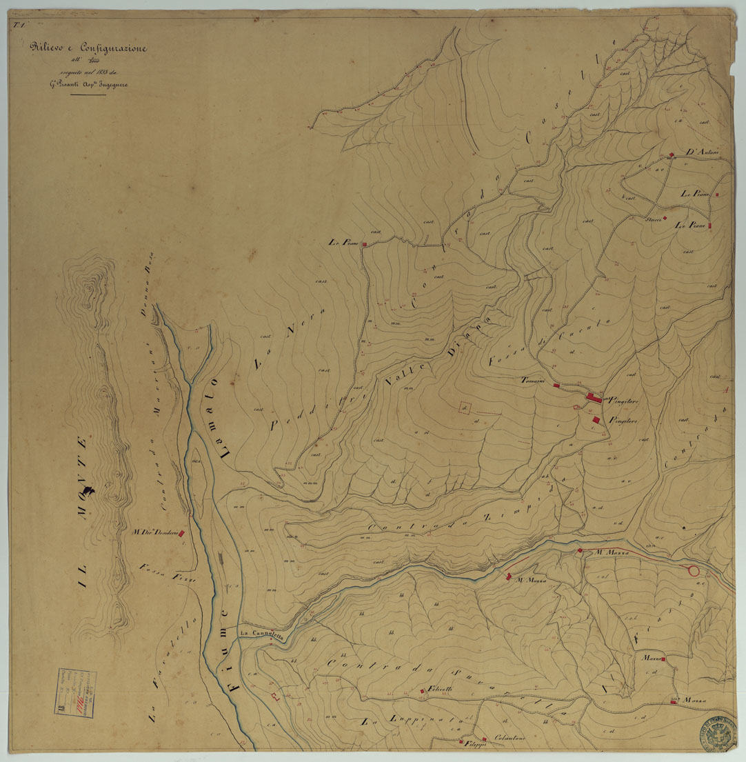 "Documento N. 19. Nove minute dei rilievi originali eseguiti dagli ufficiali ed ingegneri dell'Officio Topografico di Napoli. Rappresentano l'orografia mediante curve di livello tracciate all'equidistanza di m. 35 (m. 9,10): gli abitati sono in rosso le acque in azzurro. Ciascuna minuta reca la firma dell'operatore e la data. Annessa una "Pianta Topografica di Tiriolo e del terreno adiacente alla scala dell'1:10.000" su carta lucida, desunta dal rilievo speciale alla scala del 2.000. Il titolo non è presente sulla carta."