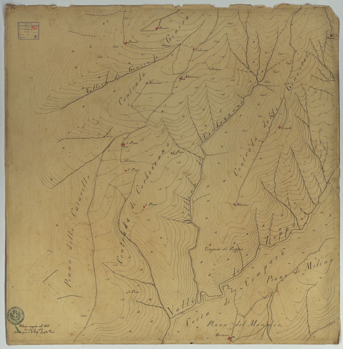 "Documento N. 19. Nove minute dei rilievi originali eseguiti dagli ufficiali ed ingegneri dell'Officio Topografico di Napoli. Rappresentano l'orografia mediante curve di livello tracciate all'equidistanza di m. 35 (m. 9,10): gli abitati sono in rosso le acque in azzurro. Ciascuna minuta reca la firma dell'operatore e la data. Annessa una "Pianta Topografica di Tiriolo e del terreno adiacente alla scala dell'1:10.000" su carta lucida, desunta dal rilievo speciale alla scala del 2.000."