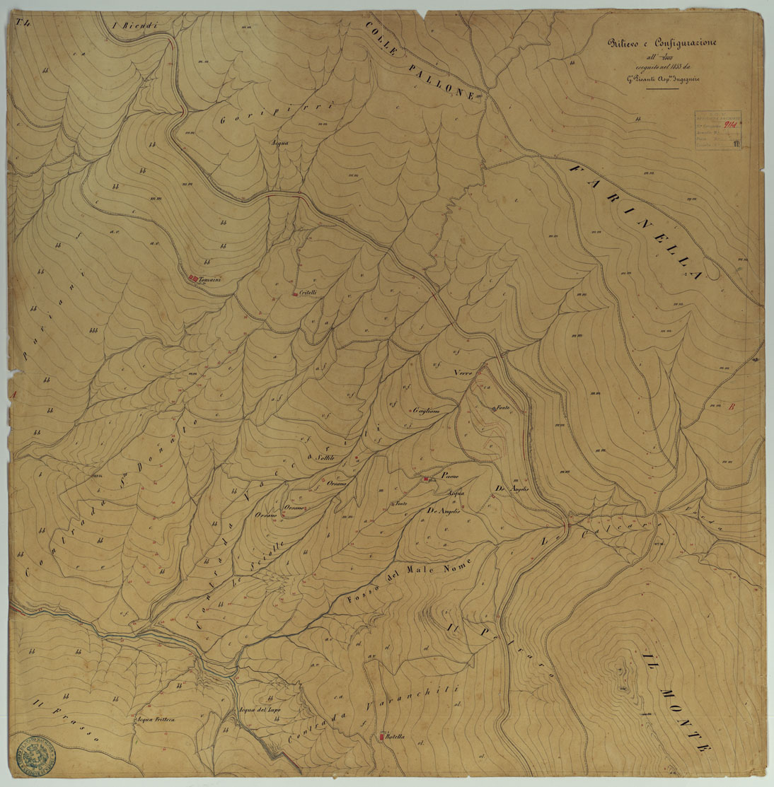 "Documento N. 19. Nove minute dei rilievi originali eseguiti dagli ufficiali ed ingegneri dell'Officio Topografico di Napoli. Rappresentano l'orografia mediante curve di livello tracciate all'equidistanza di m. 35 (m. 9,10): gli abitati sono in rosso le acque in azzurro. Ciascuna minuta reca la firma dell'operatore e la data. Annessa una "Pianta Topografica di Tiriolo e del terreno adiacente alla scala dell'1:10.000" su carta lucida, desunta dal rilievo speciale alla scala del 2.000."