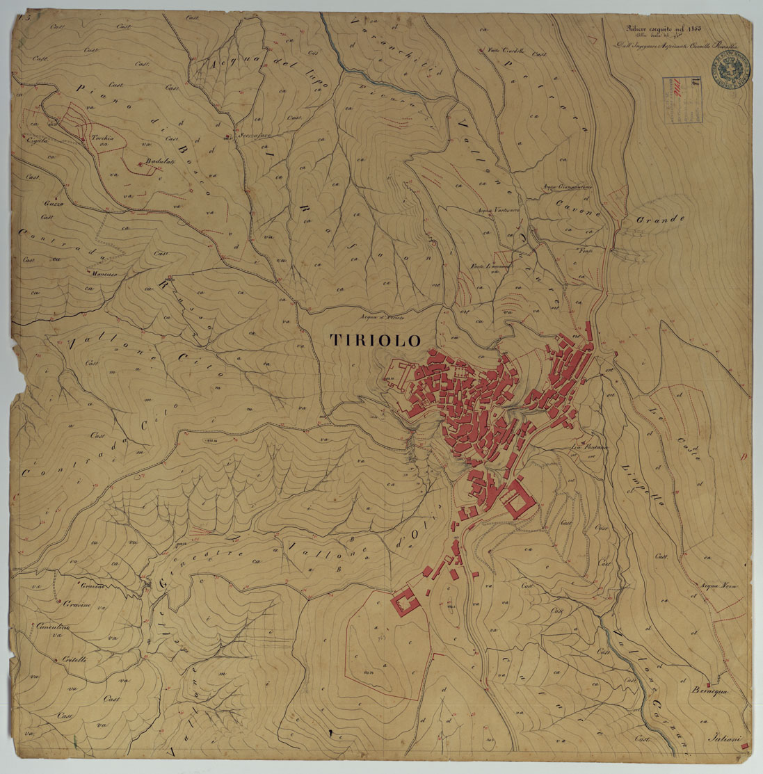 "Documento N. 19. Nove minute dei rilievi originali eseguiti dagli ufficiali ed ingegneri dell'Officio Topografico di Napoli. Rappresentano l'orografia mediante curve di livello tracciate all'equidistanza di m. 35 (m. 9,10): gli abitati sono in rosso le acque in azzurro. Ciascuna minuta reca la firma dell'operatore e la data. Annessa una "Pianta Topografica di Tiriolo e del terreno adiacente alla scala dell'1:10.000" su carta lucida, desunta dal rilievo speciale alla scala del 2.000."