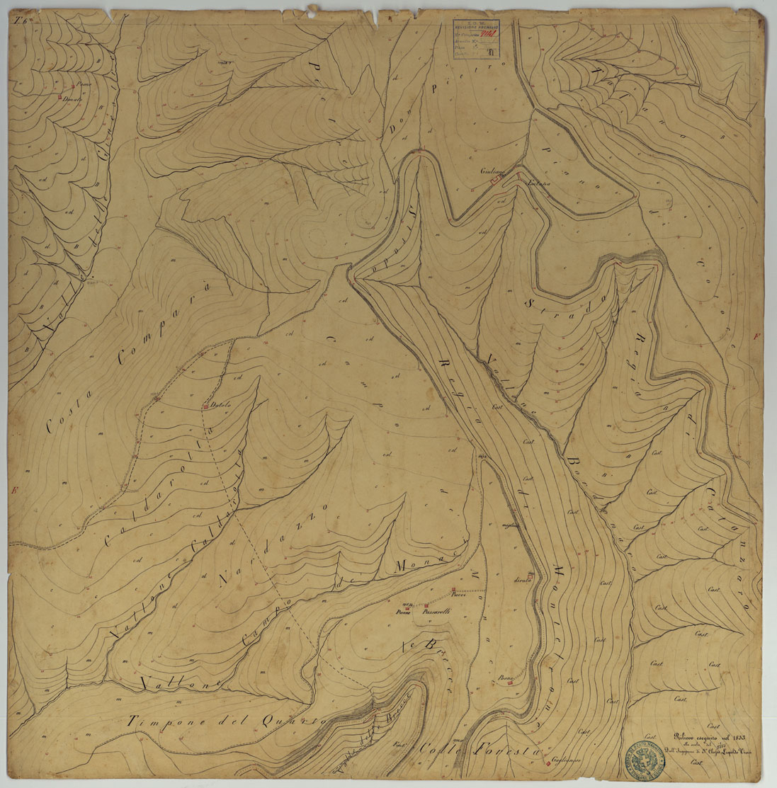 "Documento N. 19. Nove minute dei rilievi originali eseguiti dagli ufficiali ed ingegneri dell'Officio Topografico di Napoli. Rappresentano l'orografia mediante curve di livello tracciate all'equidistanza di m. 35 (m. 9,10): gli abitati sono in rosso le acque in azzurro. Ciascuna minuta reca la firma dell'operatore e la data. Annessa una "Pianta Topografica di Tiriolo e del terreno adiacente alla scala dell'1:10.000" su carta lucida, desunta dal rilievo speciale alla scala del 2.000."