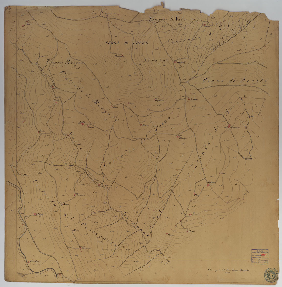 "Documento N. 19. Nove minute dei rilievi originali eseguiti dagli ufficiali ed ingegneri dell'Officio Topografico di Napoli. Rappresentano l'orografia mediante curve di livello tracciate all'equidistanza di m. 35 (m. 9,10): gli abitati sono in rosso le acque in azzurro. Ciascuna minuta reca la firma dell'operatore e la data. Annessa una "Pianta Topografica di Tiriolo e del terreno adiacente alla scala dell'1:10.000" su carta lucida, desunta dal rilievo speciale alla scala del 2.000."