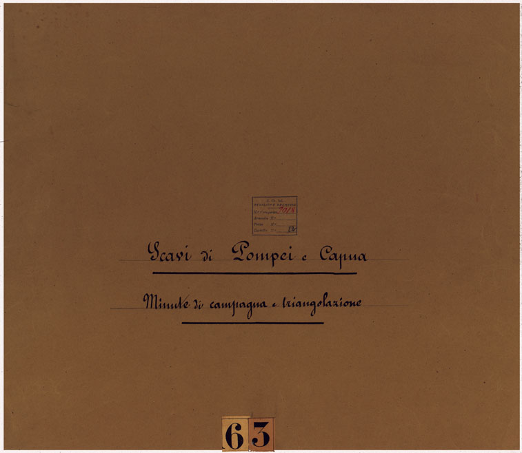 "Docum. 63. Trentatrè minute a scale varie e di dimensioni diverse, dei rilievi eseguiti dal 1826 al 1840 dall'Ing. Marchesi parte dei quali servirono per la costruzione della "Pianta degli scavi di Pompei" (Docum. 61 - n. di categorico 9016). Annessi due grafici delle triangolazioni eseguite nel 1837 e una minuta dei rilievi eseguiti nel 1852 dall'Ing. Mezzacapo."