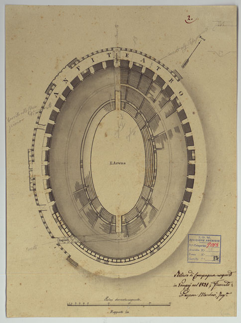 "Docum. 63. Trentatrè minute a scale varie e di dimensioni diverse, dei rilievi eseguiti dal 1826 al 1840 dall'Ing. Marchesi parte dei quali servirono per la costruzione della "Pianta degli scavi di Pompei" (Docum. 61 - n. di categorico 9016). Annessi due grafici delle triangolazioni eseguite nel 1837 e una minuta dei rilievi eseguiti nel 1852 dall'Ing. Mezzacapo."
