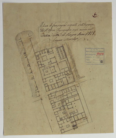 "Docum. 63. Trentatrè minute a scale varie e di dimensioni diverse, dei rilievi eseguiti dal 1826 al 1840 dall'Ing. Marchesi parte dei quali servirono per la costruzione della "Pianta degli scavi di Pompei" (Docum. 61 - n. di categorico 9016). Annessi due grafici delle triangolazioni eseguite nel 1837 e una minuta dei rilievi eseguiti nel 1852 dall'Ing. Mezzacapo."
