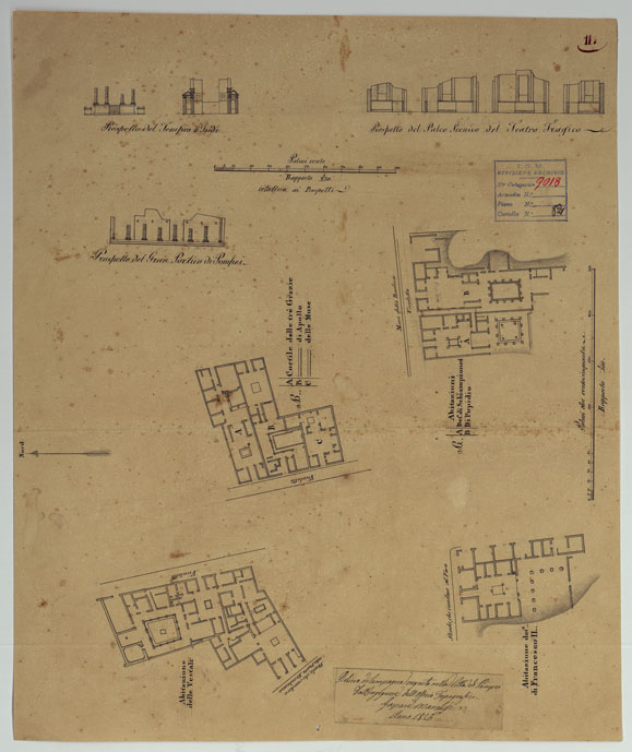 "Docum. 63. Trentatrè minute a scale varie e di dimensioni diverse, dei rilievi eseguiti dal 1826 al 1840 dall'Ing. Marchesi parte dei quali servirono per la costruzione della "Pianta degli scavi di Pompei" (Docum. 61 - n. di categorico 9016). Annessi due grafici delle triangolazioni eseguite nel 1837 e una minuta dei rilievi eseguiti nel 1852 dall'Ing. Mezzacapo."
