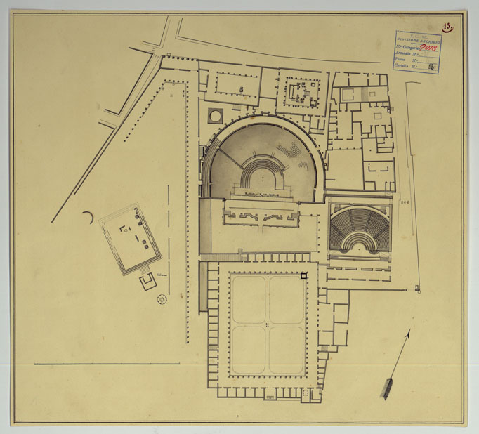 "Docum. 63. Trentatrè minute a scale varie e di dimensioni diverse, dei rilievi eseguiti dal 1826 al 1840 dall'Ing. Marchesi parte dei quali servirono per la costruzione della "Pianta degli scavi di Pompei" (Docum. 61 - n. di categorico 9016). Annessi due grafici delle triangolazioni eseguite nel 1837 e una minuta dei rilievi eseguiti nel 1852 dall'Ing. Mezzacapo."