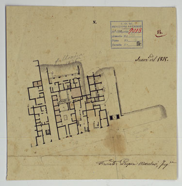 "Docum. 63. Trentatrè minute a scale varie e di dimensioni diverse, dei rilievi eseguiti dal 1826 al 1840 dall'Ing. Marchesi parte dei quali servirono per la costruzione della "Pianta degli scavi di Pompei" (Docum. 61 - n. di categorico 9016). Annessi due grafici delle triangolazioni eseguite nel 1837 e una minuta dei rilievi eseguiti nel 1852 dall'Ing. Mezzacapo."