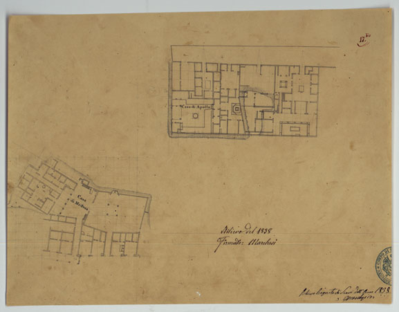 "Docum. 63. Trentatrè minute a scale varie e di dimensioni diverse, dei rilievi eseguiti dal 1826 al 1840 dall'Ing. Marchesi parte dei quali servirono per la costruzione della "Pianta degli scavi di Pompei" (Docum. 61 - n. di categorico 9016). Annessi due grafici delle triangolazioni eseguite nel 1837 e una minuta dei rilievi eseguiti nel 1852 dall'Ing. Mezzacapo."