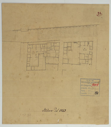 "Docum. 63. Trentatrè minute a scale varie e di dimensioni diverse, dei rilievi eseguiti dal 1826 al 1840 dall'Ing. Marchesi parte dei quali servirono per la costruzione della "Pianta degli scavi di Pompei" (Docum. 61 - n. di categorico 9016). Annessi due grafici delle triangolazioni eseguite nel 1837 e una minuta dei rilievi eseguiti nel 1852 dall'Ing. Mezzacapo."
