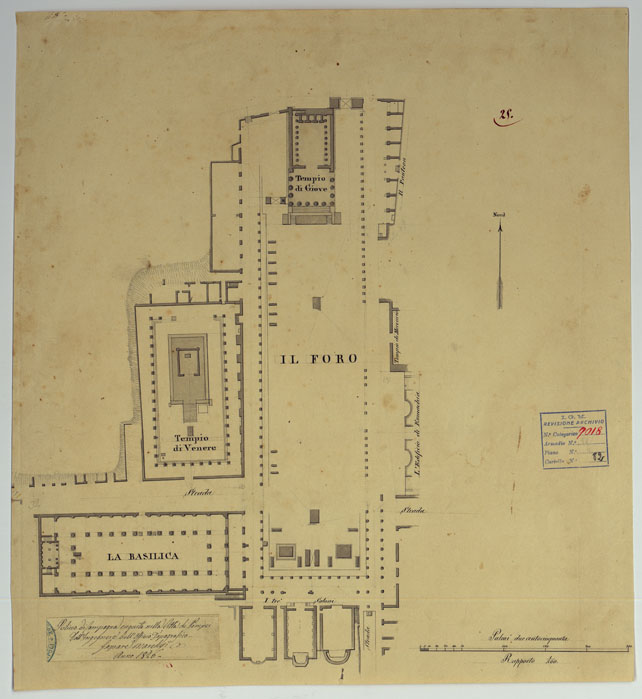 "Docum. 63. Trentatrè minute a scale varie e di dimensioni diverse, dei rilievi eseguiti dal 1826 al 1840 dall'Ing. Marchesi parte dei quali servirono per la costruzione della "Pianta degli scavi di Pompei" (Docum. 61 - n. di categorico 9016). Annessi due grafici delle triangolazioni eseguite nel 1837 e una minuta dei rilievi eseguiti nel 1852 dall'Ing. Mezzacapo."