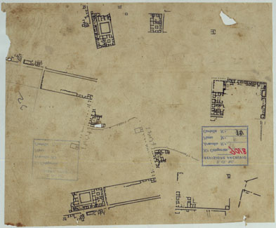 "Docum. 63. Trentatrè minute a scale varie e di dimensioni diverse, dei rilievi eseguiti dal 1826 al 1840 dall'Ing. Marchesi parte dei quali servirono per la costruzione della "Pianta degli scavi di Pompei" (Docum. 61 - n. di categorico 9016). Annessi due grafici delle triangolazioni eseguite nel 1837 e una minuta dei rilievi eseguiti nel 1852 dall'Ing. Mezzacapo. In questa minuta il numero del foglio è riportato a lapis."