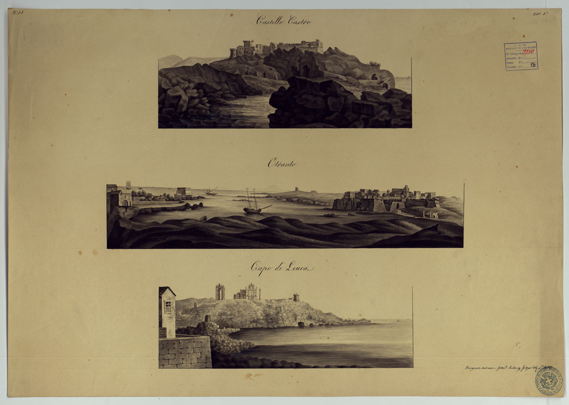 "Documenti n. 75 e 76. Sei tavole ad acquerello datate al 1817 firmate, tre da Ludovig Fetzer e tre dal Barone Groenzenstein tenente del Regg.to Corazzieri Austriaco. Le tavole contengono rispettivamente: Docum. 75 -Tav. 53-1) Castello di Castro, Otranto, Capo di Leuca Docum. 75 -Tav. 54-2) Monte Gargano, Saline e Costa di Barletta, Castello di Brindisi, Torre di Penne e Castello di Brindisi Docum. 75 -Tav. 55-3) Capo di Otranto, Capo di S. Maria di Leuca, Costa d'Albania Docum. 76 -Tav. 56-1) Capo di S. Maria di Leuca, Veduta della Costa tra Castro ed Otranto, Porto di Vadisco, Costa d'Albania Docum. 76 -Tav. 57-2) Porto e Costa di Otranto, Porto di Brindisi e il Castello, Carovigno ed Ostuni Docum. 76 -Tav. 58-3) Barletta, Monte Gargano. Le tavole di questo documento, come pure dei Docum. 78-1 e 78-2 - numero di Categorico 10113 e il Docum. 77 - numero di Categorico 10112 - si riconnettono ai lavori eseguiti dal 1817 al 1819 dagli ufficiali austriaci dell'Ist. Geografico di Milano per la Carta Idrografica dell'Adriatico e delle isole Ionie il lavoro venne eseguito con il concorso dell'Officio Topografico di Napoli sotto la guida del Col. Visconti e del Cap. inglese W. Smyth. (Cfr. Firrao C., "Sull'Officio Topografico di Napoli, Origini e vicende, 1868"."