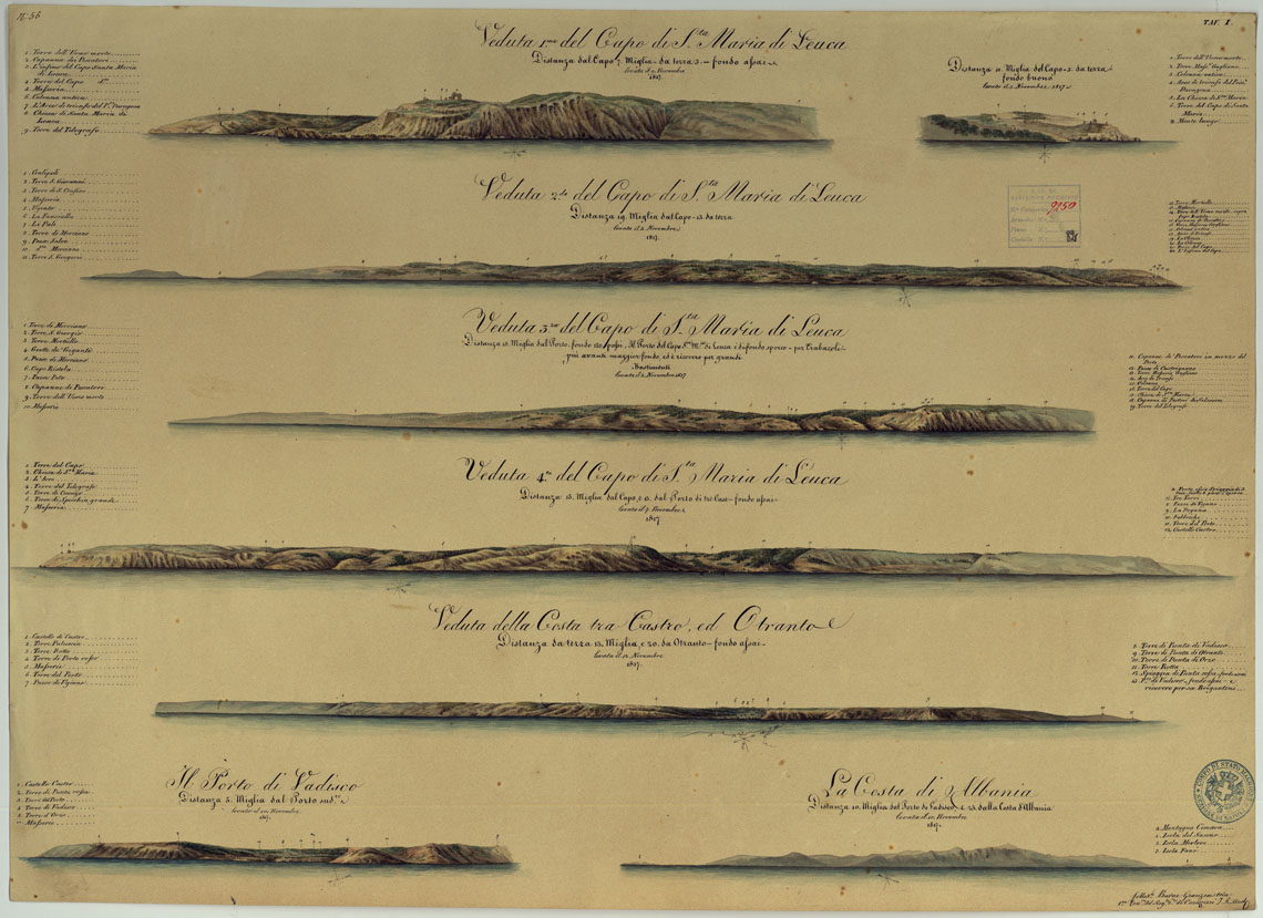 "Documenti n. 75 e 76. Sei tavole ad acquerello datate al 1817 firmate, tre da Ludovig Fetzer e tre dal Barone Groenzenstein tenente del Regg.to Corazzieri Austriaco. Le tavole contengono rispettivamente: Docum. 75 -Tav. 53-1) Castello di Castro, Otranto, Capo di Leuca Docum. 75 -Tav. 54-2) Monte Gargano, Saline e Costa di Barletta, Castello di Brindisi, Torre di Penne e Castello di Brindisi Docum. 75 -Tav. 55-3) Capo di Otranto, Capo di S. Maria di Leuca, Costa d'Albania Docum. 76 -Tav. 56-1) Capo di S. Maria di Leuca, Veduta della Costa tra Castro ed Otranto, Porto di Vadisco, Costa d'Albania Docum. 76 -Tav. 57-2) Porto e Costa di Otranto, Porto di Brindisi e il Castello, Carovigno ed Ostuni Docum. 76 -Tav. 58-3) Barletta, Monte Gargano. Le tavole di questo documento, come pure dei Docum. 78-1 e 78-2 - numero di Categorico 10113 e il Docum. 77 - numero di Categorico 10112 - si riconnettono ai lavori eseguiti dal 1817 al 1819 dagli ufficiali austriaci dell'Ist. Geografico di Milano per la Carta Idrografica dell'Adriatico e delle isole Ionie il lavoro venne eseguito con il concorso dell'Officio Topografico di Napoli sotto la guida del Col. Visconti e del Cap. inglese W. Smyth. (Cfr. Firrao C., "Sull'Officio Topografico di Napoli, Origini e vicende, 1868"."