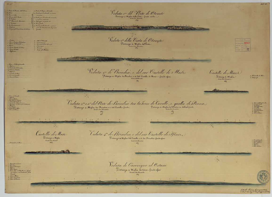 "Documenti n. 75 e 76. Sei tavole ad acquerello datate al 1817 firmate, tre da Ludovig Fetzer e tre dal Barone Groenzenstein tenente del Regg.to Corazzieri Austriaco. Le tavole contengono rispettivamente: Docum. 75 -Tav. 53-1) Castello di Castro, Otranto, Capo di Leuca Docum. 75 -Tav. 54-2) Monte Gargano, Saline e Costa di Barletta, Castello di Brindisi, Torre di Penne e Castello di Brindisi Docum. 75 -Tav. 55-3) Capo di Otranto, Capo di S. Maria di Leuca, Costa d'Albania Docum. 76 -Tav. 56-1) Capo di S. Maria di Leuca, Veduta della Costa tra Castro ed Otranto, Porto di Vadisco, Costa d'Albania Docum. 76 -Tav. 57-2) Porto e Costa di Otranto, Porto di Brindisi e il Castello, Carovigno ed Ostuni Docum. 76 -Tav. 58-3) Barletta, Monte Gargano. Le tavole di questo documento, come pure dei Docum. 78-1 e 78-2 - numero di Categorico 10113 e il Docum. 77 - numero di Categorico 10112 - si riconnettono ai lavori eseguiti dal 1817 al 1819 dagli ufficiali austriaci dell'Ist. Geografico di Milano per la Carta Idrografica dell'Adriatico e delle isole Ionie il lavoro venne eseguito con il concorso dell'Officio Topografico di Napoli sotto la guida del Col. Visconti e del Cap. inglese W. Smyth. (Cfr. Firrao C., "Sull'Officio Topografico di Napoli, Origini e vicende, 1868"."