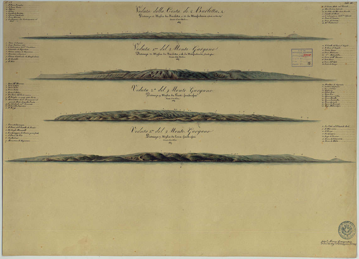 "Documenti n. 75 e 76. Sei tavole ad acquerello datate al 1817 firmate, tre da Ludovig Fetzer e tre dal Barone Groenzenstein tenente del Regg.to Corazzieri Austriaco. Le tavole contengono rispettivamente: Docum. 75 -Tav. 53-1) Castello di Castro, Otranto, Capo di Leuca Docum. 75 -Tav. 54-2) Monte Gargano, Saline e Costa di Barletta, Castello di Brindisi, Torre di Penne e Castello di Brindisi Docum. 75 -Tav. 55-3) Capo di Otranto, Capo di S. Maria di Leuca, Costa d'Albania Docum. 76 -Tav. 56-1) Capo di S. Maria di Leuca, Veduta della Costa tra Castro ed Otranto, Porto di Vadisco, Costa d'Albania Docum. 76 -Tav. 57-2) Porto e Costa di Otranto, Porto di Brindisi e il Castello, Carovigno ed Ostuni Docum. 76 -Tav. 58-3) Barletta, Monte Gargano. Le tavole di questo documento, come pure dei Docum. 78-1 e 78-2 - numero di Categorico 10113 e il Docum. 77 - numero di Categorico 10112 - si riconnettono ai lavori eseguiti dal 1817 al 1819 dagli ufficiali austriaci dell'Ist. Geografico di Milano per la Carta Idrografica dell'Adriatico e delle isole Ionie il lavoro venne eseguito con il concorso dell'Officio Topografico di Napoli sotto la guida del Col. Visconti e del Cap. inglese W. Smyth. (Cfr. Firrao C., "Sull'Officio Topografico di Napoli, Origini e vicende, 1868"."