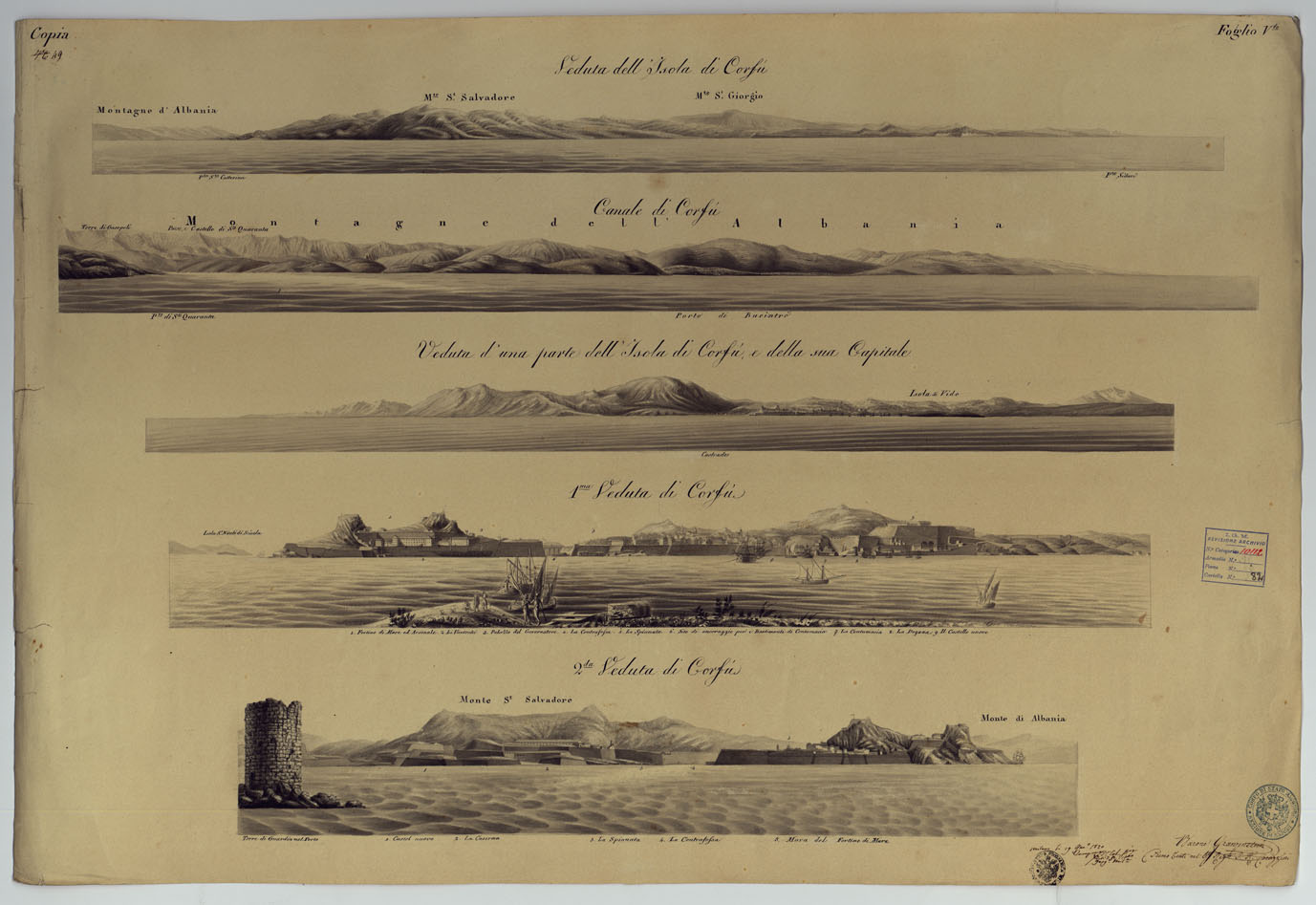 "Docum. n. 77. Cinque tavole ad acquerello datate 1818 e firmate dal Barone di Groenzenstein. Esse contengono rispettivamente: Docum. 77-Tav. 45-1) Vedute del Porto di Budua, Antivari, Drino Docum. 77-Tav. 46-2) Capo Rodoni, Capi Pali e Durazzo Docum. 77-Tav. 47-3) Durazzo-Capo Laghy, Porto di Valona e Bay Ducathes, Montagne di Cimara Docum. 77-Tav. 48-4) Porto di Palermo, Porto di Quaranta, Montagne di Cimara, Isole scogli e secche del Canale di Corfù Docum. 77-Tav. 49-5) Corfù isola e canale. Le tavole di questo documento, come pure dei Docum. 78-1 e 78-2 - numero di Categorico 10113 e il Docum. 75 e 76 - numero di Categorico 9250, si riconnettono ai lavori eseguiti dal 1817 al 1819 dagli ufficiali austriaci dell'Ist. Geografico di Milano per la Carta Idrografica dell'Adriatico e delle isole Ionie il lavoro venne eseguito con il concorso dell'Officio Topografico di Napoli sotto la guida del Col. Visconti e del Cap. inglese W. Smyth. (Cfr. Firrao C., "Sull'Officio Topografico di Napoli, Origini e vicende, 1868"."