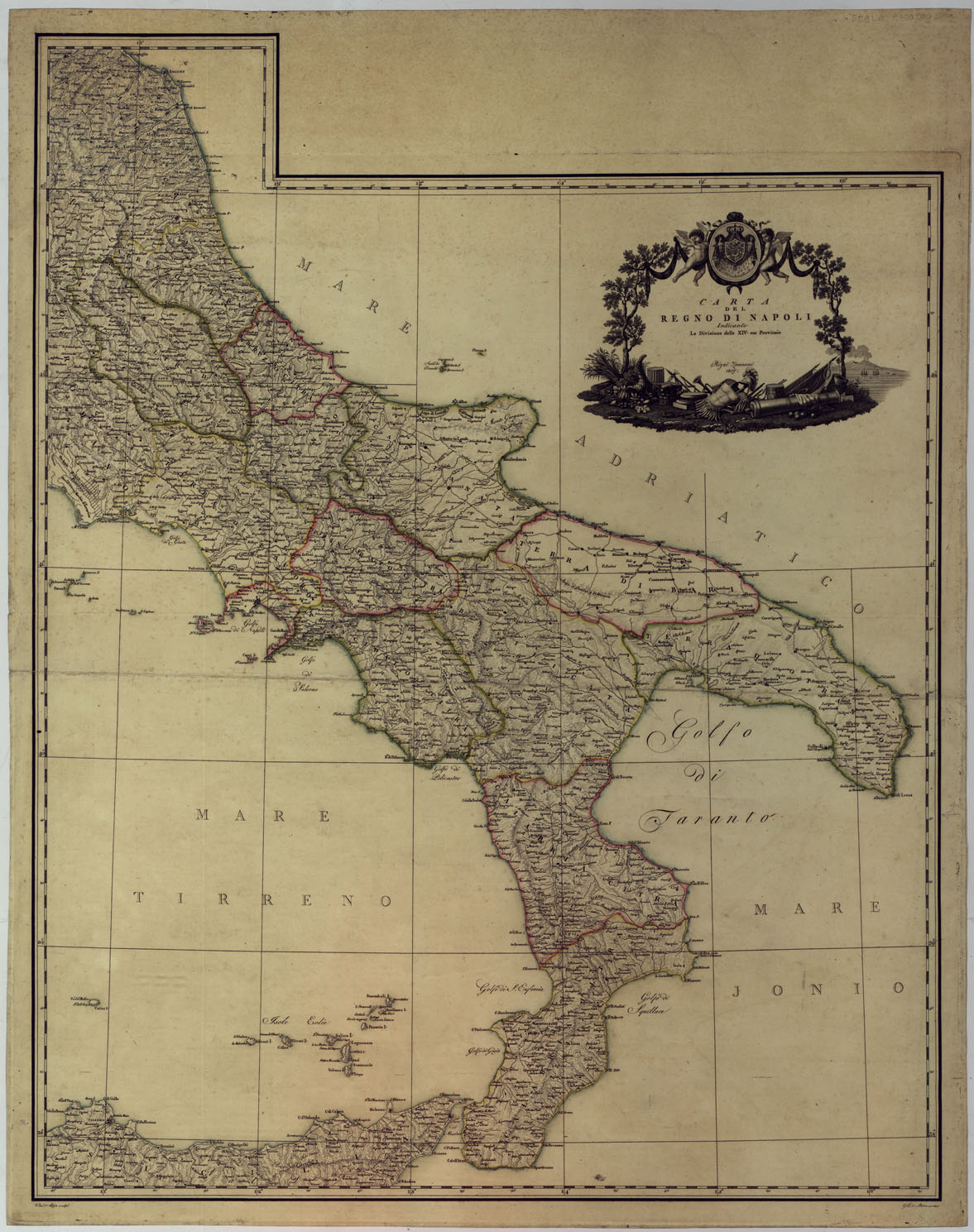 CARTA DEL REGNO DI NAPOLI INDICANTE LA DIVISIONE DELLE XIV SUE PROVINCIE. RIZZI ZANNONI, 1807.