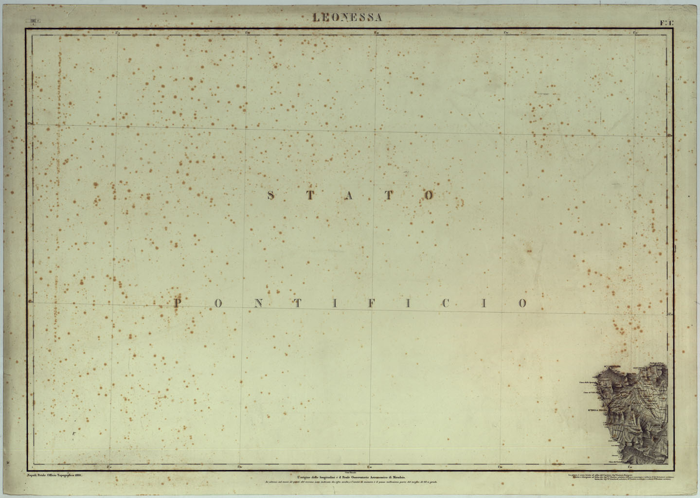 "Il titolo non è presente sulla carta. Questo foglio ha una copia. Otto fogli pubblicati dal 1839 al 1875, parte dal Reale Officio Topografico di Napoli, alcuni dall ' Ufficio Superiore dello Stato Maggiore, Sezione di Napoli, uno dall ' Istituto Topografico Militare taluni sono incompleti. Essi sono gli unici fogli iniziati della progettata carta del Regno di Napoli all'80.000 (v. N° 43 d ' ordine, Cart. d ' Arch. N.i. 77-80. Docum. N° 9). L'orografia vi è rappresentata col tratteggio a luce obliqua con aggiunta delle curve di livello tracciate all'equidistanza di 10 passi. Annessi frammenti della carta originale disegnati per i fogli I e IV. La copia N° 79 d'inv. gen., di appartenenza alla Biblioteca, consta dei fogli, in duplicato N.i. 1, 2, 3 (Gaeta, Caserta, Napoli) pubblicati dal Reale Officio Topografico rispettivamente nel 1858, 1875 e 1839. Questo foglio riporta la data 1861."
