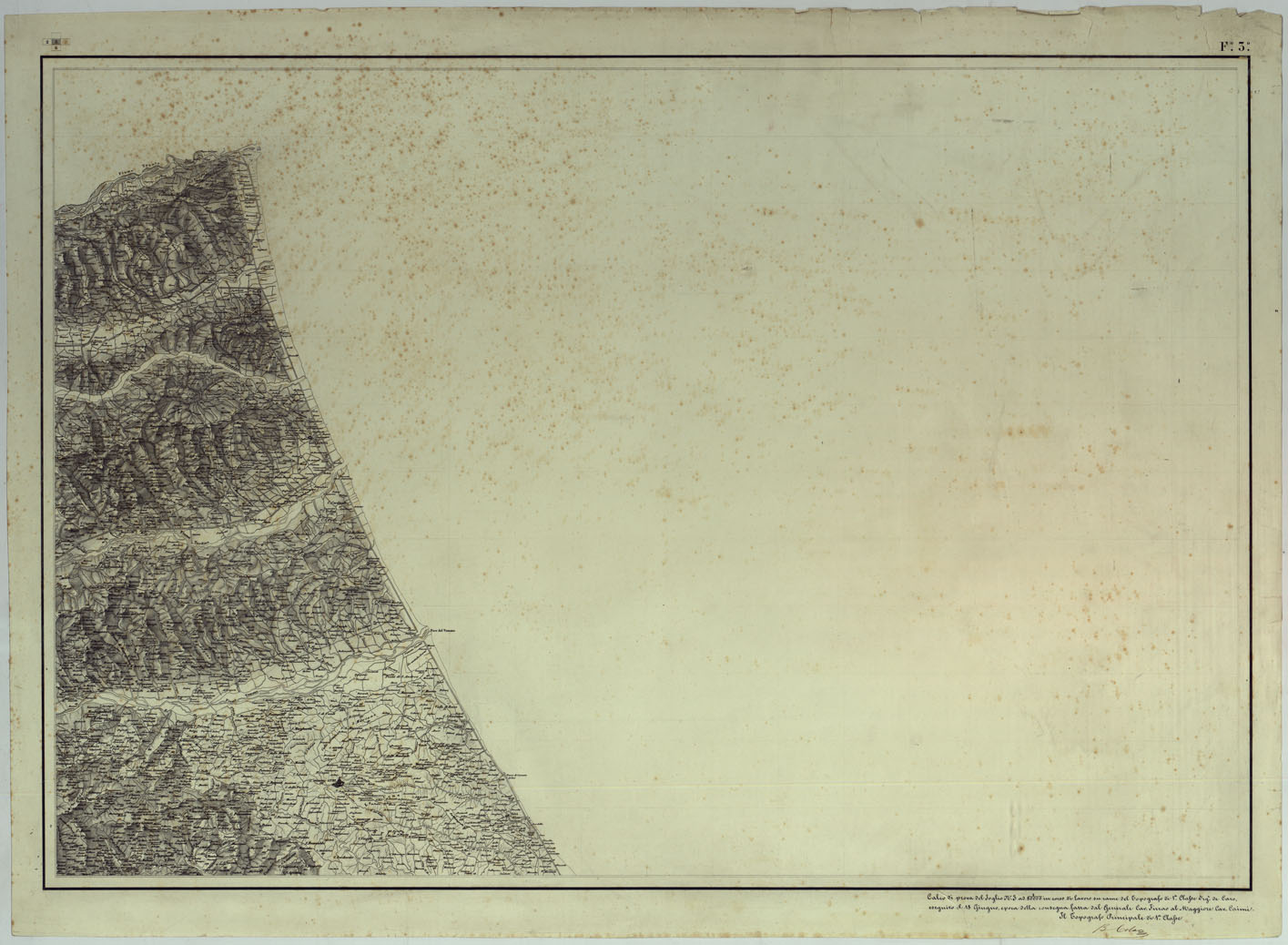 "Il titolo non è presente sulla carta. Otto fogli pubblicati dal 1839 al 1875, parte dal Reale Officio Topografico di Napoli, alcuni dall ' Ufficio Superiore dello Stato Maggiore, Sezione di Napoli, uno dall ' Istituto Topografico Militare taluni sono incompleti. Essi sono gli unici fogli iniziati della progettata carta del Regno di Napoli all'80.000 (v. N° 43 d ' ordine, Cart. d ' Arch. N.i. 77-80. Docum. N° 9). L'orografia vi è rappresentata col tratteggio a luce obliqua con aggiunta delle curve di livello tracciate all'equidistanza di 10 passi. Annessi frammenti della carta originale disegnati per i fogli I e IV. La copia N° 79 d'inv. gen., di appartenenza alla Biblioteca, consta dei fogli, in duplicato N.i. 1, 2, 3 (Gaeta, Caserta, Napoli) pubblicati dal Reale Officio Topografico rispettivamente nel 1858, 1875 e 1839. Calco di prova del foglio n. 3."