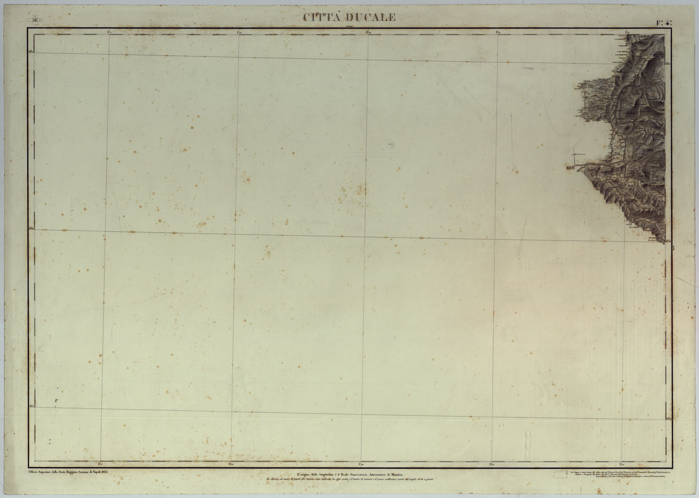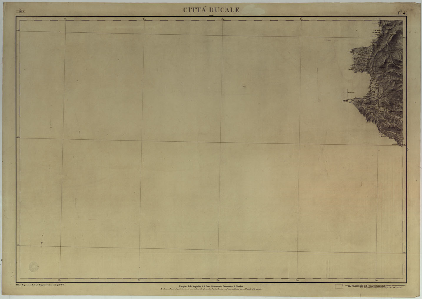 "Il titolo non è presente sulla carta. Otto fogli pubblicati dal 1839 al 1875, parte dal Reale Officio Topografico di Napoli, alcuni dall ' Ufficio Superiore dello Stato Maggiore, Sezione di Napoli, uno dall ' Istituto Topografico Militare taluni sono incompleti. Essi sono gli unici fogli iniziati della progettata carta del Regno di Napoli all'80.000 (v. N° 43 d ' ordine, Cart. d ' Arch. N.i. 77-80. Docum. N° 9). L'orografia vi è rappresentata col tratteggio a luce obliqua con aggiunta delle curve di livello tracciate all'equidistanza di 10 passi. Annessi frammenti della carta originale disegnati per i fogli I e IV. La copia N° 79 d'inv. gen., di appartenenza alla Biblioteca, consta dei fogli, in duplicato N.i. 1, 2, 3 (Gaeta, Caserta, Napoli) pubblicati dal Reale Officio Topografico rispettivamente nel 1858, 1875 e 1839. Questo foglio riporta la data 1863. In questo documento sono presenti tre fogli con titolo Foglio 4 per per differenziare e per facilitare la ricerca sono state inserite le lettere a,b,c."