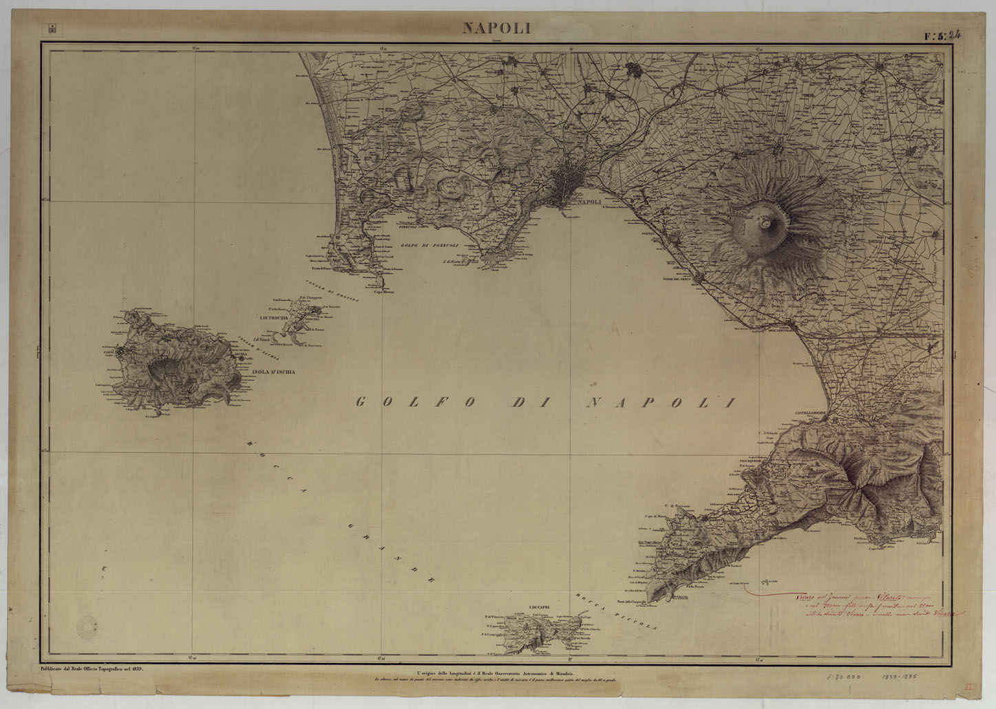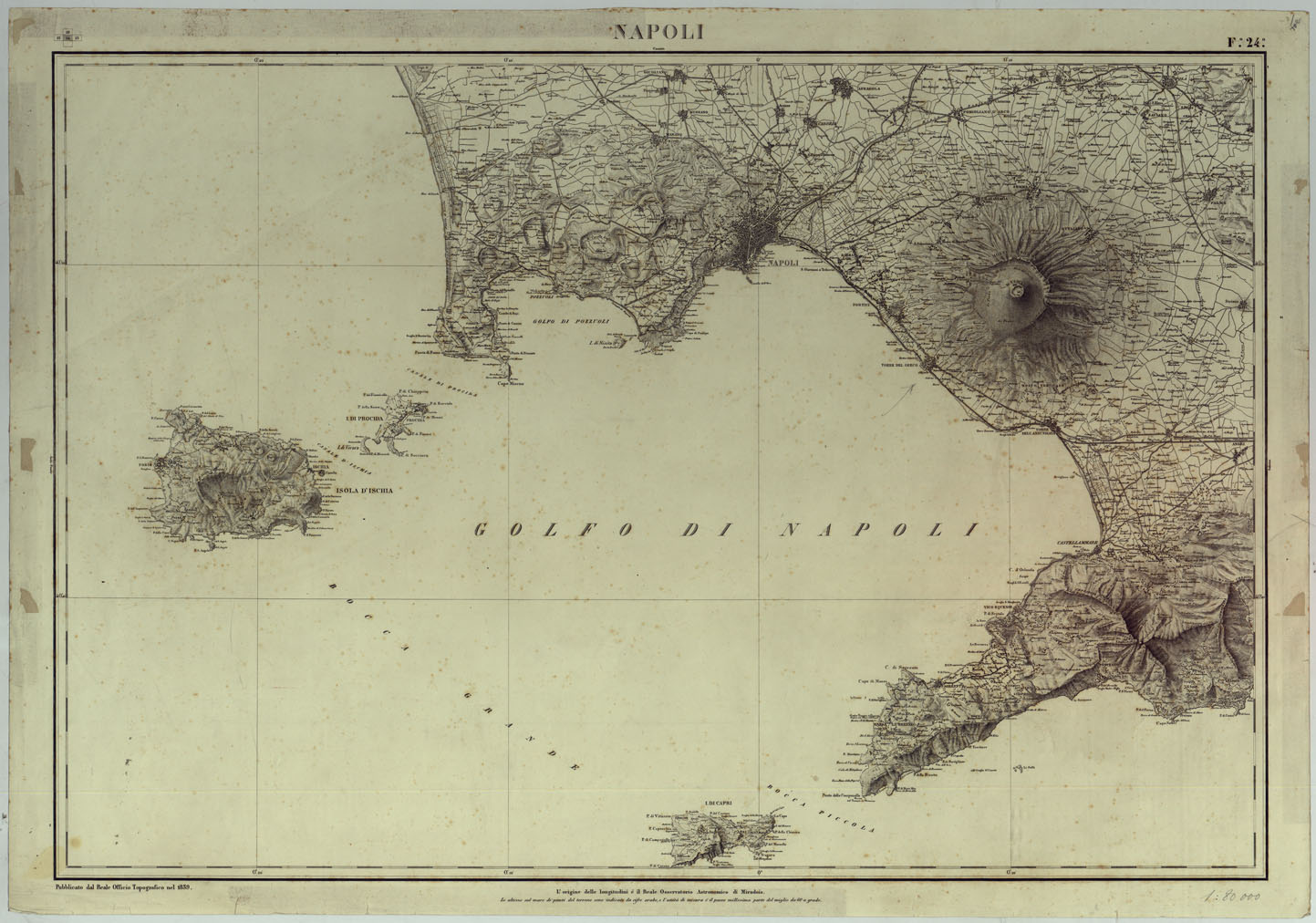 "Otto fogli pubblicati dal 1839 al 1875, parte dal Reale Officio Topografico di Napoli, alcuni dall ' Ufficio Superiore dello Stato Maggiore, Sezione di Napoli, uno dall ' Istituto Topografico Militare taluni sono incompleti. Essi sono gli unici fogli iniziati della progettata carta del Regno di Napoli all'80.000 (v. N° 43 d ' ordine, Cart. d ' Arch. N.i. 77-80. Docum. N° 9). L'orografia vi è rappresentata col tratteggio a luce obliqua con aggiunta delle curve di livello tracciate all'equidistanza di 10 passi. Annessi frammenti della carta originale disegnati per i fogli I e IV. La copia N° 79 d'inv. gen., di appartenenza alla Biblioteca, consta dei fogli, in duplicato N.i. 1, 2, 3 (Gaeta, Caserta, Napoli) pubblicati dal Reale Officio Topografico rispettivamente nel 1858, 1875 e 1839. Questo foglio riporta la data 1839."