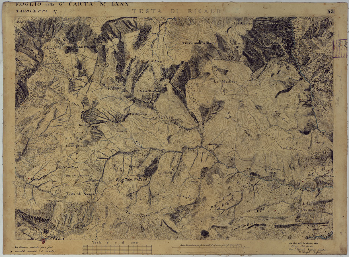 "Rilievo regolare in 99 tavolette (minute di campagna) del territorio della Contea di Nizza. Il rilievo è dimostrato a curve orizzontali, tracciate all'equidistanza di 10 metri. Gli operatori furono ufficiali di armi diverse, probabilmente allievi della Scuola di S. M. : Avet, Albert, Borson, Basso, Bergalli, Costanze, Cordon, Ceva, Colli, Carderina, Cordero, Coda, Di Pralormo, Dal Pozzo, De Fornari, De Candia, D'Angennes, Escoffier, Federici, Falicon, Govone, La Grange, La Fleche, Muletti, Marazzano, Mazè, Morozzo, Mariani, Pictet, Ponzani, Piola Caselle, Righini, Rinaudo, Ricci, S. Andrea, Somis, Villamarina. "