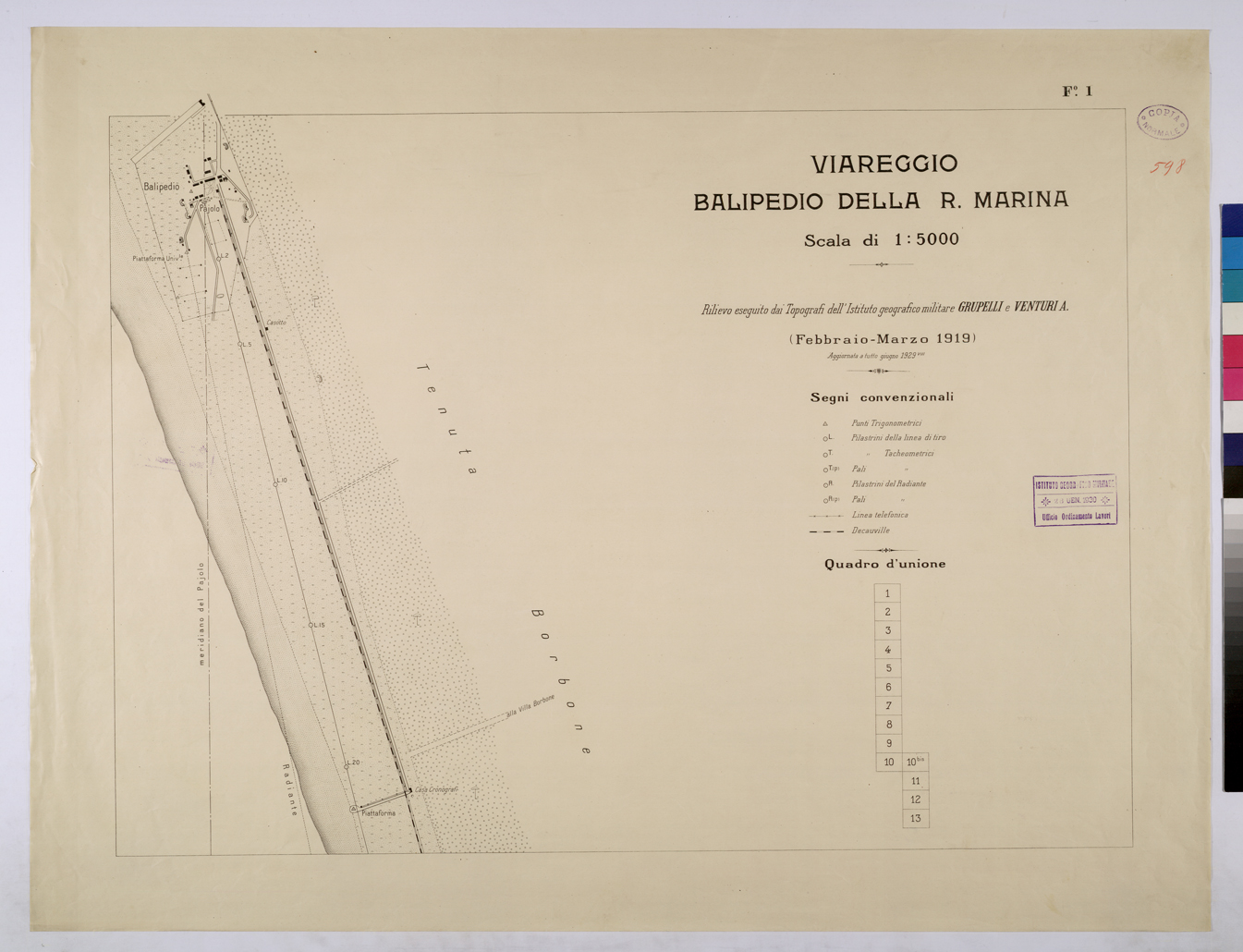 "Rilievo eseguito dai Topografi dell'Istituto Geografico Militare Grupelli e Ventura A. Aggiornata a tutto giugno 1929."