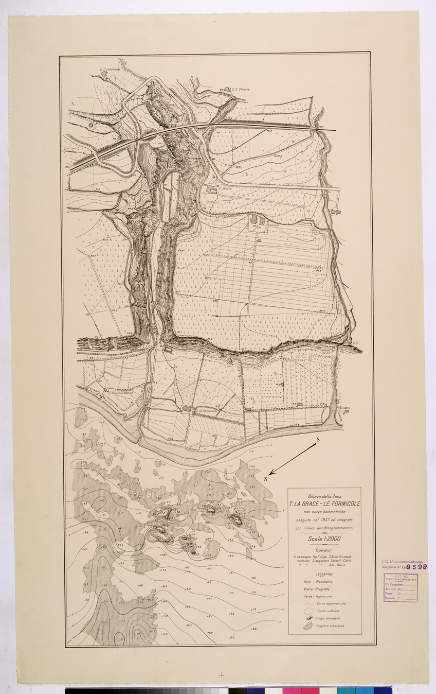 RILIEVO DELLA ZONA T. LA BRACE LE FORMICOLE CON CURVE BATOMETRICHE ESEGUITO NEL 1937 ED INTEGRATE CON RILIEVO AEROFOGRAMMETRICO.