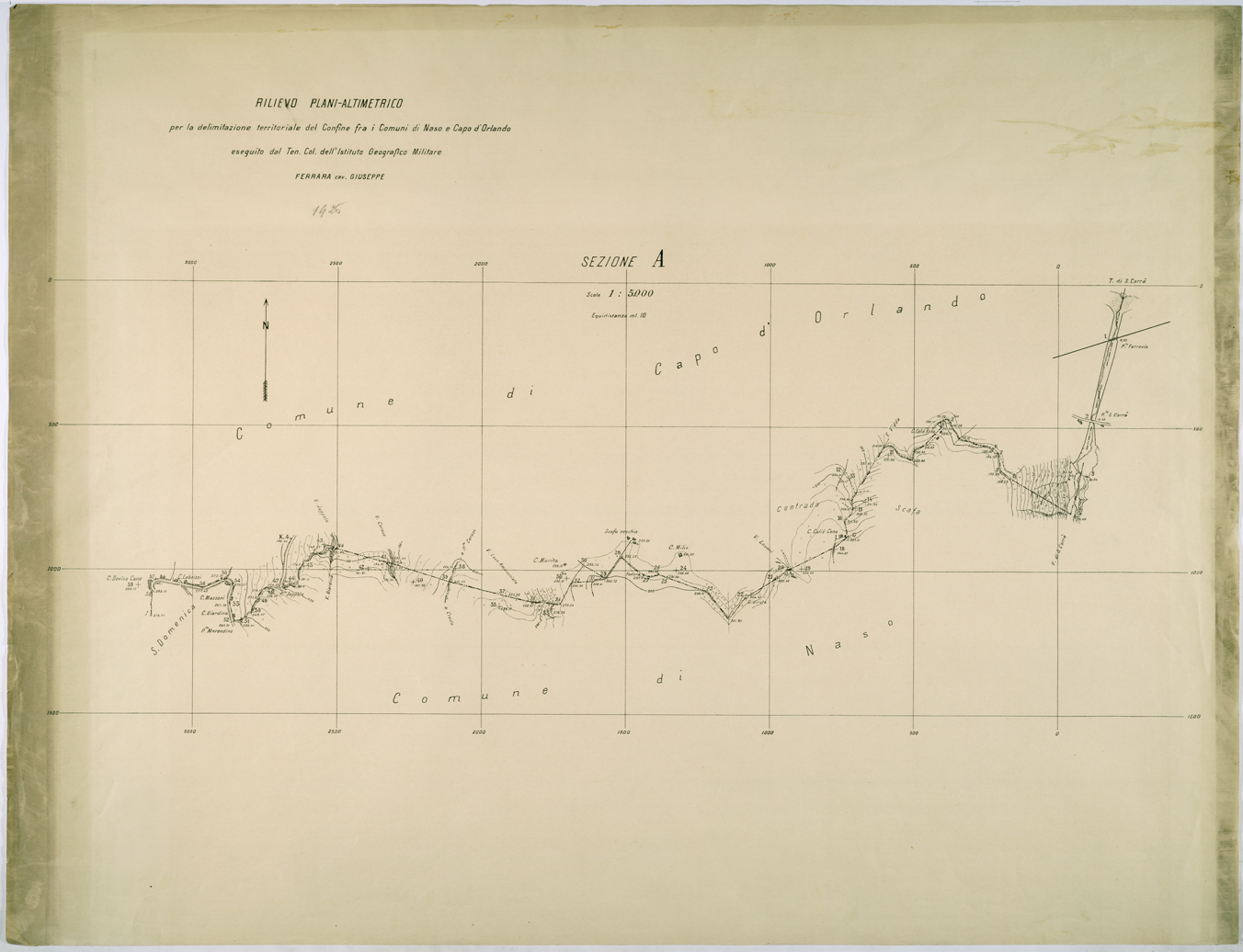 RILIEVO PLANI-ALTIMETRICO PER LA DELINEAZIONE DEL CONFINE FRA I COMUNI DI NASO E CAPO D'ORLANDO ESEGUITO DAL TEN COL. DELL'ISTITUTO GEOGRAFICO MILITARE FERRARA CAV. GIUSEPPE - SEZIONE A.
