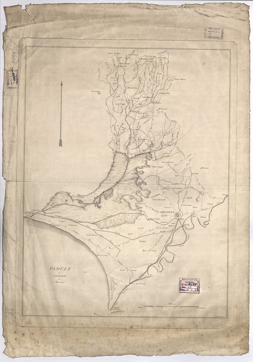 "Incisione su rame in foglio unico. Stampa in nero. In basso a destra la scritta: "L e B Laboratorio1829". La rappresentazione risulta particolarmente dettagliata per la rete idrica. Scala grafica in braccia fiorentine ( circa 56.000). Confronta anche Coll. Pasqui n. 25 (" Pianta del Padule di Castiglioni ed Adiacenze... ") Esiste un negativo fotografico archiviato con l'originale che documenta una riproduzione successiva della carta. E' catalogata a pag 306 del "Catalogo Ragionato-parte seconda" dell'Istituto Geografico Militare" (gruppo 9-n° d'ordine 33) "