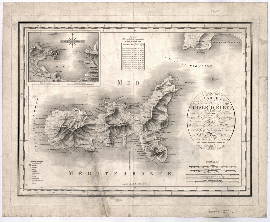 "Incisione su rame di A. Blondeau in foglio unico (ai lati del titolo le scritte a sinistra: "Gravé par All.dro Blondeau" e a destra: "Ecrit par Charles Piquet". Orografia rappresentata col tratteggio a luce obliqua. Centri abitati e strade distinte secondo la loro importanza. Longitudini calcolate dal meridiano di Parigi. In alto elenco dei punti trigonometrici e cartina del Porto di Portoferraio alla scala di 1:30.000. Scale grafiche in metri, tese francesi, miglia d'Italia, leghe di Francia, miglia di Germania (circa 1:100.000). E' catalogata a pag 305 del "Catalogo Ragionato-parte seconda" dell'Istituto Geografico Militare" (gruppo 9-n° d'ordine 28). La carta in scala 1:100.000 costituisce un prodotto d'eccezione per la delineazione dell'isola toscana, per la prima volta, in forma geometrica, oltre che per l'indicazione delle quote altimetriche dei monti Capanne e Calamita, rilevate in modo innovativo con la trigonometria, e per la considerazione di tutti gli insediamenti anche isolati, delle strade (route) e dei sentieri (chemin). Cfr. ROMBAI L., Toscana geometrica. La prima corografia geodetica regionale e il contributo dell'Osservatorio Ximeniano. I.G.M., 2008, pag. 38. "
