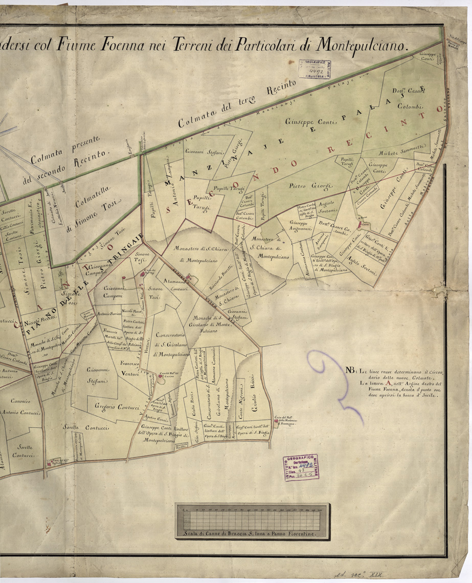 "Disegno ad inchiostro e acquerello con indicazione delle proprietà e relativi nominativi. "Scale di Canne di Braccia S l'una a Panno Fiorentine" (1:3.500 circa). "
