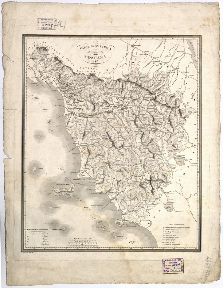 "Incisione su rame di G. Pozzi e G. Maina, su disegno di V. Angeli. A sinistra in basso l´indicazione dei compartimenti, in basso a destra i segni convenzionali con i centri abitati e le strade distinte secondo la loro importanza. Scala in miglia Toscane, miglia Italiane e metri ( circa 1:600.000) E´ derivata dalla carta di G. Inghirami: Collez. Bianconi N° 215, Collez. Pasqui N°15, Cartella d'Archivio N° 69 Docum. N° 3. Scala grafica "