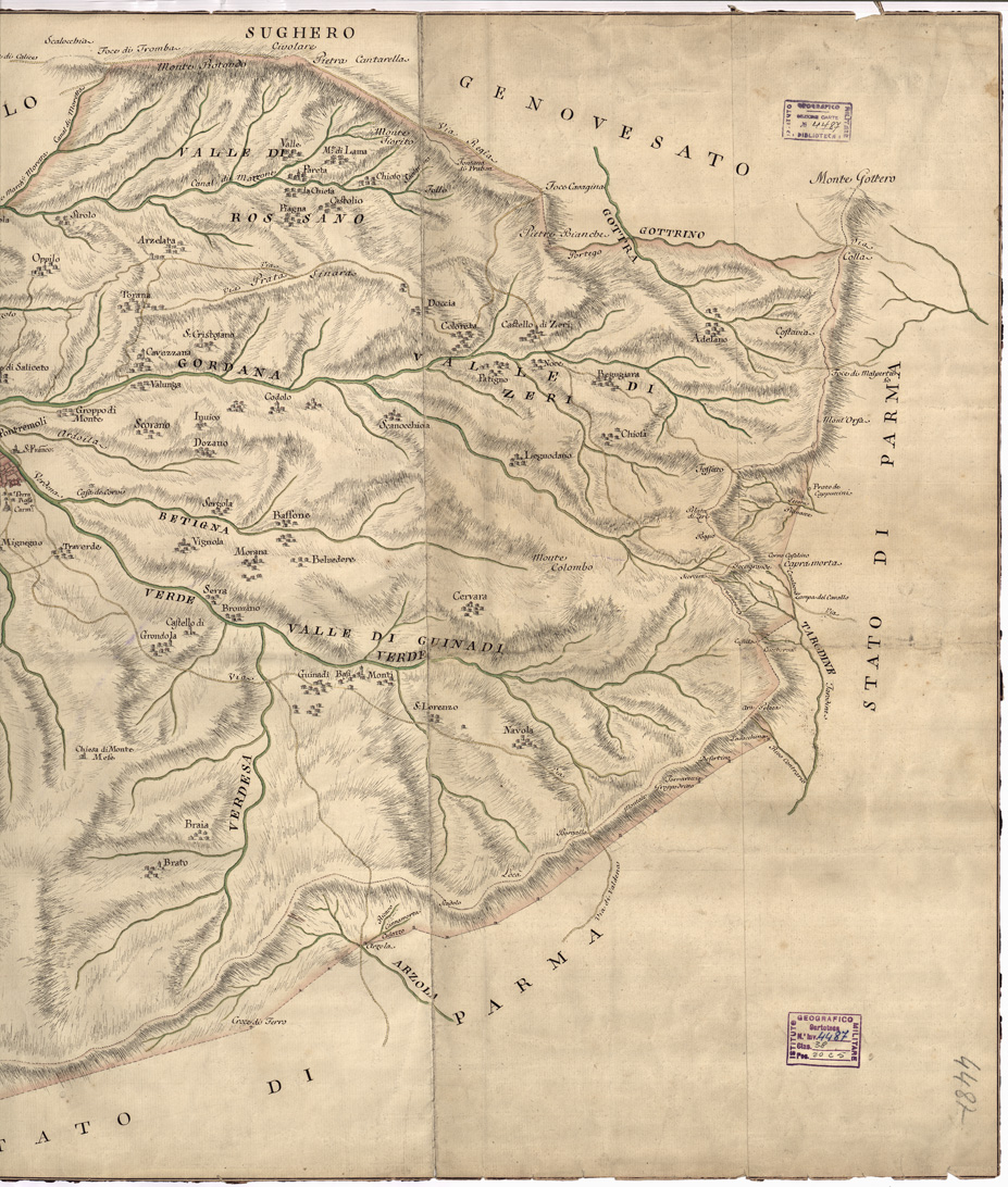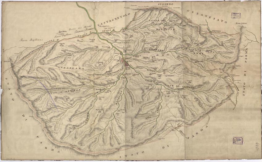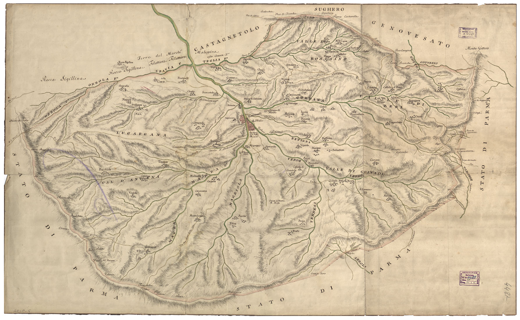 "Epoca fine del secolo XVIII. Scala 1:27.000 circa. Carta manoscritta, senza titolo, autore nè data. Rappresenta il territorio di Pontremoli fino ai confini dello Stato di Parma e del Genovesato. E´ orientata col nord invertito al basso. L´orografia è rappresentata schematicamente con tratteggio. Gli abitati sono rappresentati con torri e case, centro Pontremoli che è in pianta. Sono tracciate le strade. Le acque sono colorate in verde."