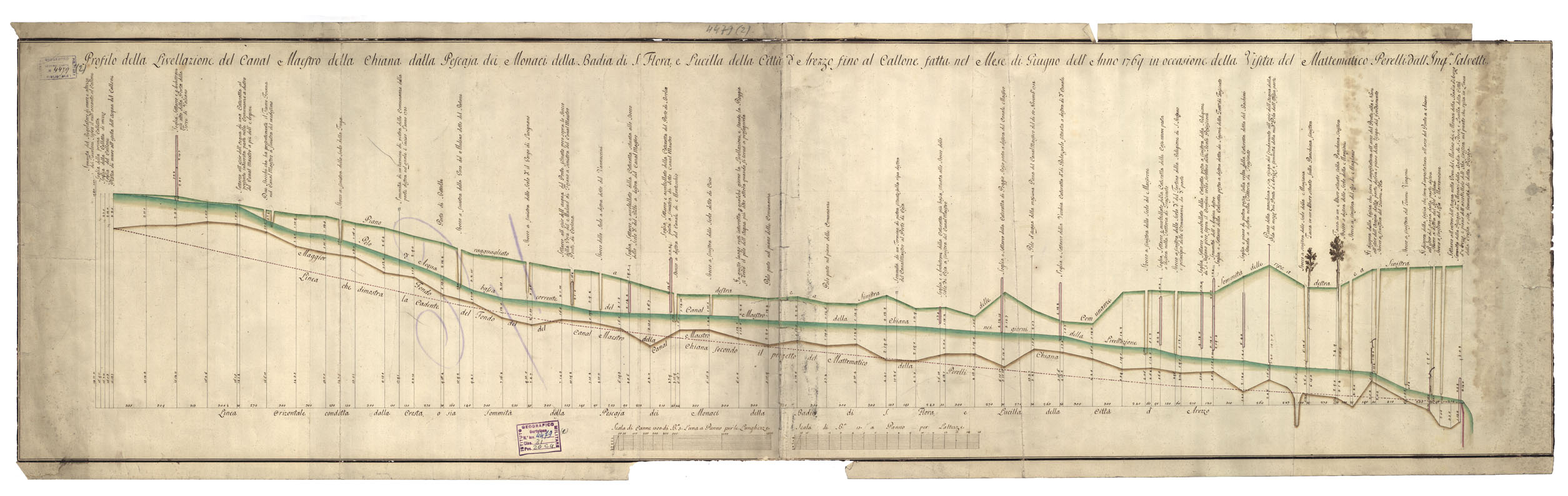 PROFILO DELLA LIVELLAZIONE DEL CANAL MAESTRO DELLA CHIANA DALLA PESCAIA DEI MONACI DELLA BADIA DI S. FLORA E LUCILLA DELLA CITTA' D'AREZZO FINO AL CALLONE - Val di Chiana