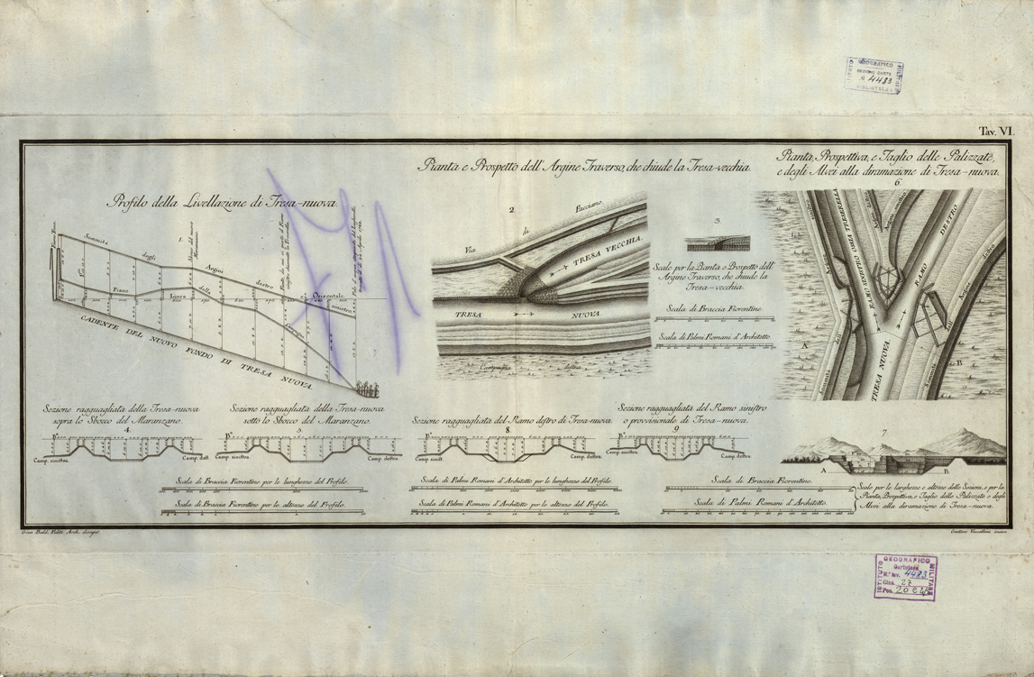 "SALVATORE PICCIOLI ING. DELINEO'. COSIMO ZOCCHI INCISE. Pianta della Val di Chiana eseguita in seguito alla perizia composta di Benedetto Passionei, Pio Fantoni matematico, Andrea Vici ingegnere e Domenico Sardi ingegnere, delegati dello Stato Pontificio e il Conte Federico da Montauto, Pietro Ferroni e GiuseppeSalvetti ingegnere, commissari del Gran Duca di Toscana. Incisione su rame. Scala grafica in canne fiorentine e in canne romane. Annesse n. 7 tavole delle stesse dimensioni con vari profili a scale varie disegnate da Capretti A. e da Giu. Bald. Puliti, incise da C. Colombini B. Eredi, Gio. Batta Cecchi e G. Vascellini."